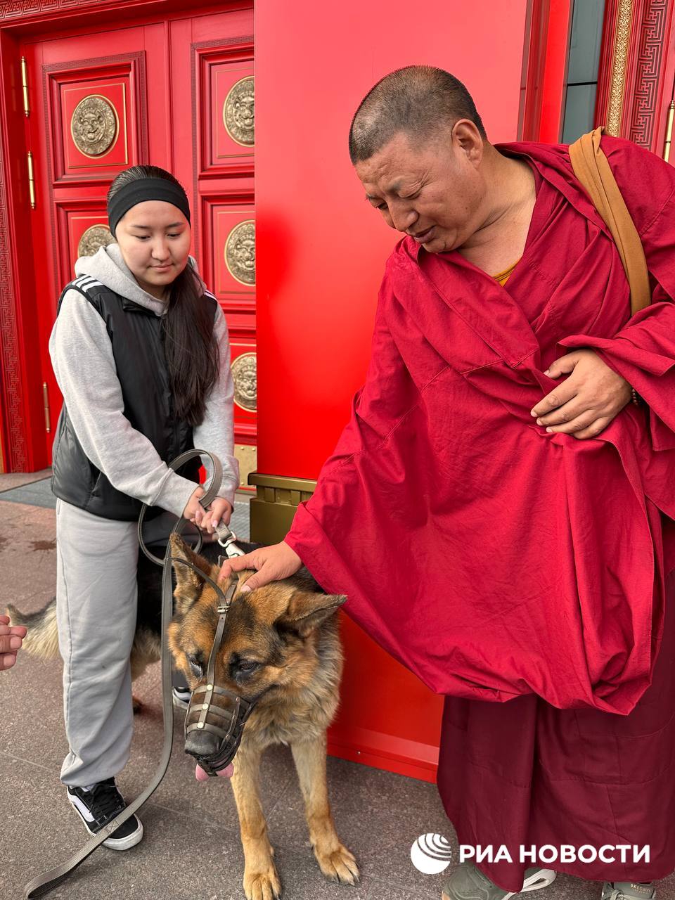 Делегации монастырей тибетской традиции Гьюдмед и Дрепунг Гоманг, а также тувинское буддийское духовенство впервые благословили спасенных от гибели собак кызыльского приюта "Хатико" и домашних животных жителей Кызыла.