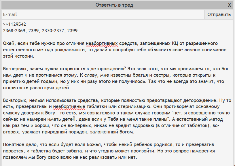 >>1129250 Христианство не вымирает. Число христиан увеличивается с каждым годом. А вообще большинство семейных христиан, включая семейных католиков (судя по опросам), запрет Ватикана на неабортивные контрацептивы для супругов не понимает и не принимает.