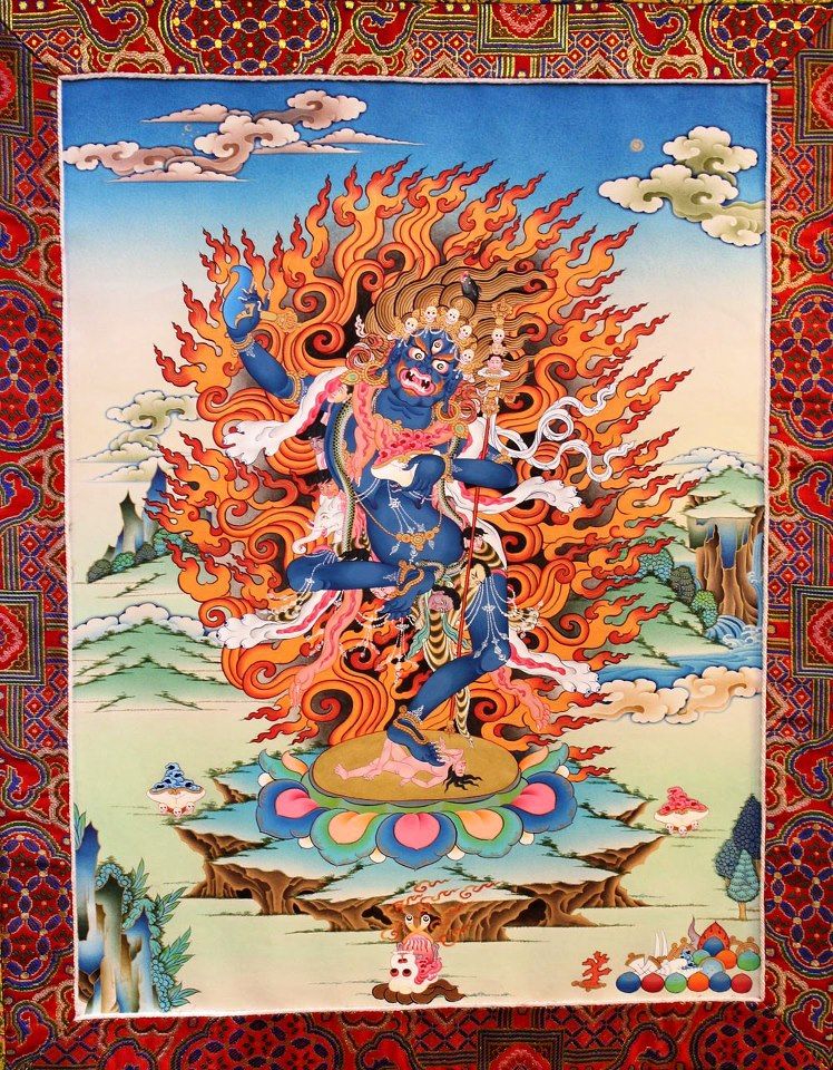 1. Первым кто услышал прозревшего Будду был нага 2. 7головый Муцилинда про поражение которого писали еще древние за тысячелетия до н.э, но видимо не убили, скрылся царь наг охранял Будду, он же дракон Апокалипсиса 3. Демоничность защитников дхармы, многоголовость, многорукость, многолазость. Все это присуще асурам, они же титаны, гиганты >Согласно « Завету Ба» , Трисонг Децен пригласил буддийского настоятеля и индийского философа Шантаракшиту (725–788) в Тибет, чтобы распространять буддизм и помочь основать первый буддийский монастырь в Самье («Непостижимом»). Однако некоторые события, такие как затопление буддийского храма и удар молнии в королевский дворец, заставили некоторых при тибетском дворе поверить, что местные боги разгневаны причем подозрительно чилил в пещере >Когда королевский двор начал подозревать, что Падмасамбхава хочет захватить власть, король попросил его уйти