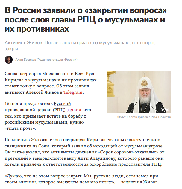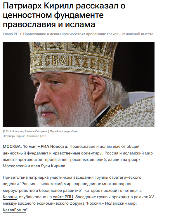 6 июля, на трапезе по окончании Божественной литургии в Храме Христа Спасителя Москвы, патриарх Московский Кирилл (Гундяев) заявил о наличии в России сил, которые выступают против сотрудничества православных и мусульман.