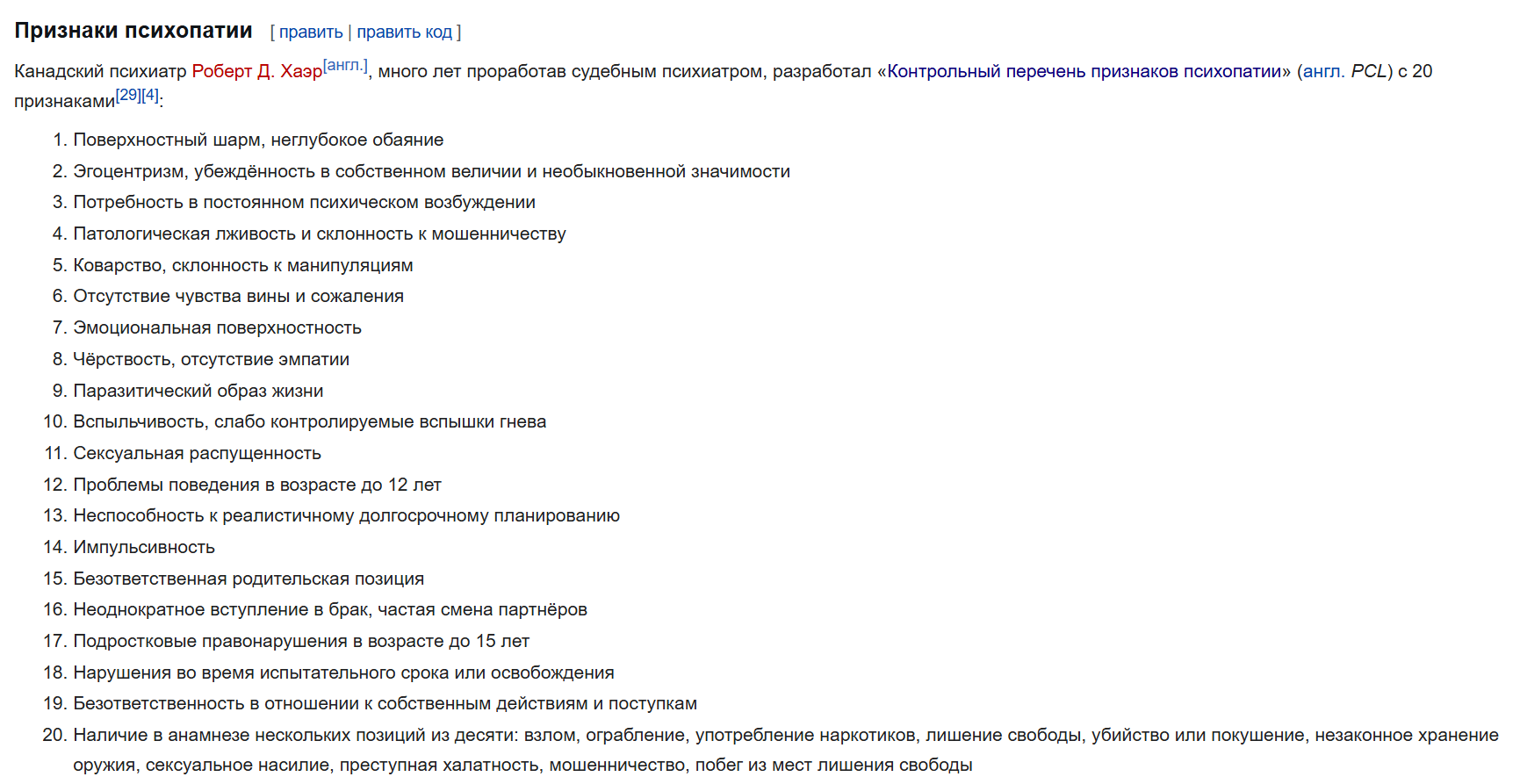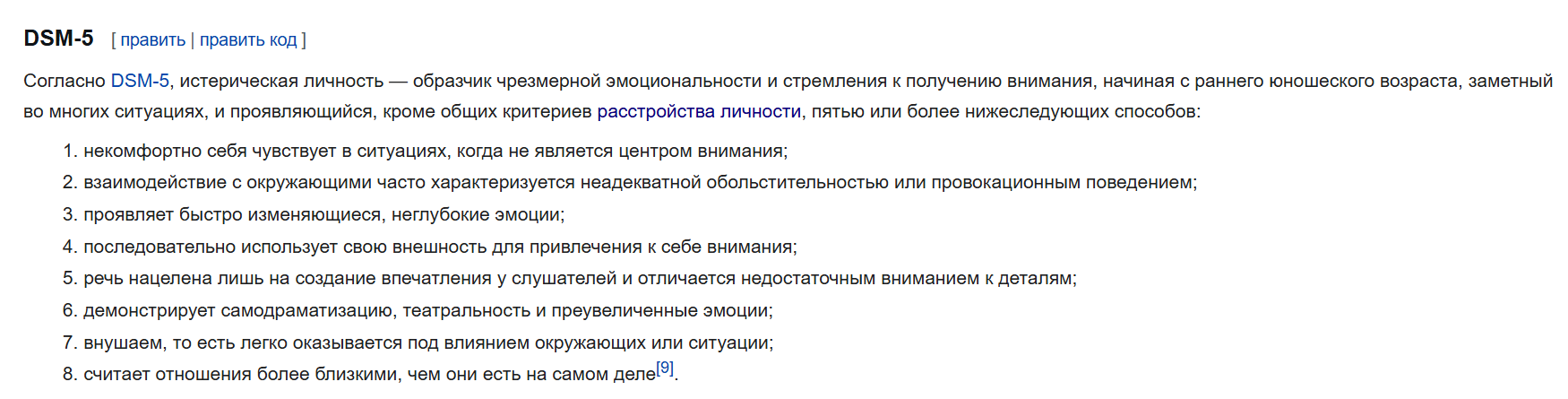 По истерическому расстройству личности там полное бинго, за исключением п. 4, это требует наблюдений ИРЛ. По психопатии совершенно определенно представлены признаки с 1 по 8 и 19.