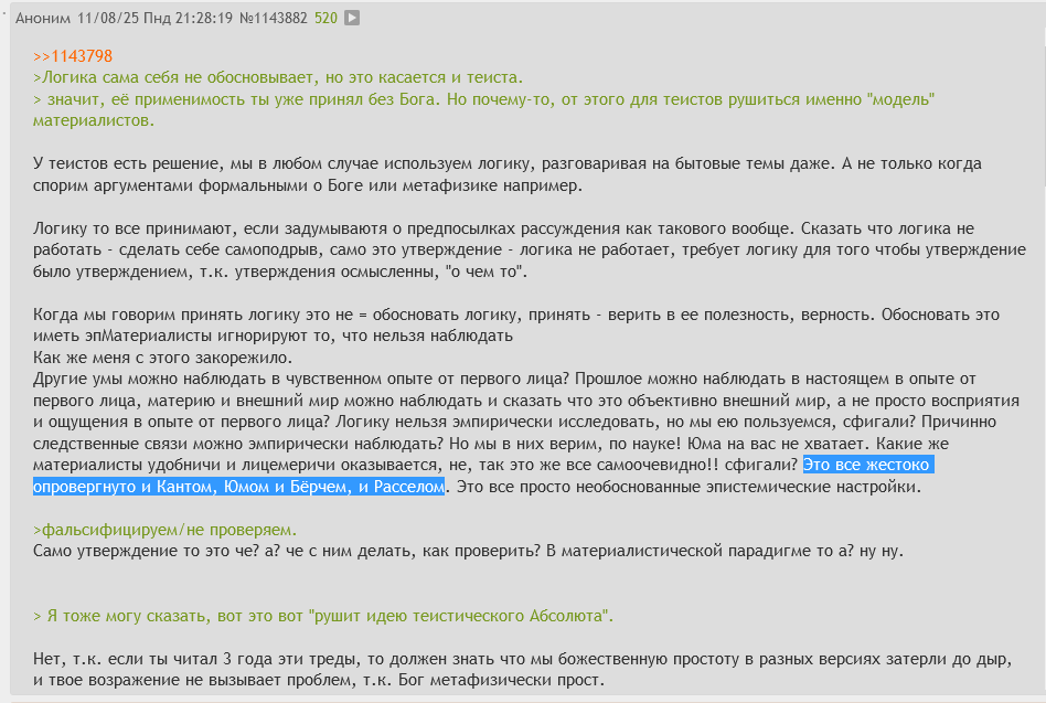 >>1144458 >это сколько лет прошло, 15, 20, 30 19 >...и человек мается неофитскими вопросами. не маялся бы, если бы был ответ для меня >Не знал про II Ватиканский Собор. представь, в воскресной школе деткам о нем не рассказывают, а потом уже ходил на автомате, не задаваясь богословскими вопросами >То есть для тебя ощущение божественного заключается во всяких побрякушках, внешних атрибутах? Нет, я вообще про иное >Ты женат, сколько у тебя детей? Женат, венчан, пока один, хочу много. Тут не поймаешь. >ты откуда вообще информацию о католичестве черпал, из газет 18 века и рыцарских романов чтоли? у меня не было потребности ее откуда-то черпать, пока я был номинальным прихожанином, что на катехизации сказали, то и знал, а катехизация была в нулевых крайне поверхностная. >Приверженец ТЛМ был на ТЛМ всего раз в жизни. Ты говоришь так, будто ее в каждом приходе каждое воскресенье служат. >ТЛМ в некоторых местах служится совершенно легально. В НЕКОТОРЫХ. Знаешь, скольким людям они недоступны тупо из-за их местоположения? >Так ты тогда вообще к византийскому обряду и традиции принадлежишь. Ищи-свищи этот обряд. >Исповедь необходима всем, кто хочет принять таинство. Смертный грех из любви к жене кончить не туда без интенции к предохранению? Ну ты серьезно? >Оправдание амазонского синода Понял тебя, можешь не продолжать. >В отдельно взятом православии меньше, но все равно достаточно, при том, что от Вселенской Церкви у них одно название. Я не говорил, что бегу принимать православие, я всего лишь сказал, что у меня возникает уныние и вопросы. Да, я согласен, что мое восприятие и познания могут быть поверхностными. Я вообще заметил, что в православных тредах, что в католических (не только тут), если у тебя познаний меньше, чем на бакалавра богословия, то какой тебе вообще свободный выбор религии, ты ж тупой, тебе орган/лавочки/Матрона/русский дух, а не Господь.
