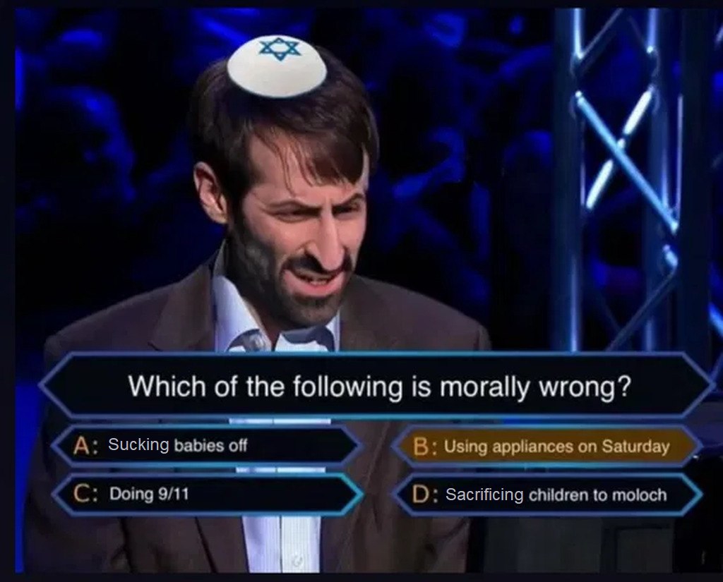 >>1155472 (OP) >2. Aboda Zara 26b: "Даже лучших из гоев следует убивать." Это гнусная клевета и антисемитский поклеп. Любой иудей знает, что гои нужны в качестве рабов. Когда придет Машиах, он даст каждому еврею по 2500 гоев в служение.