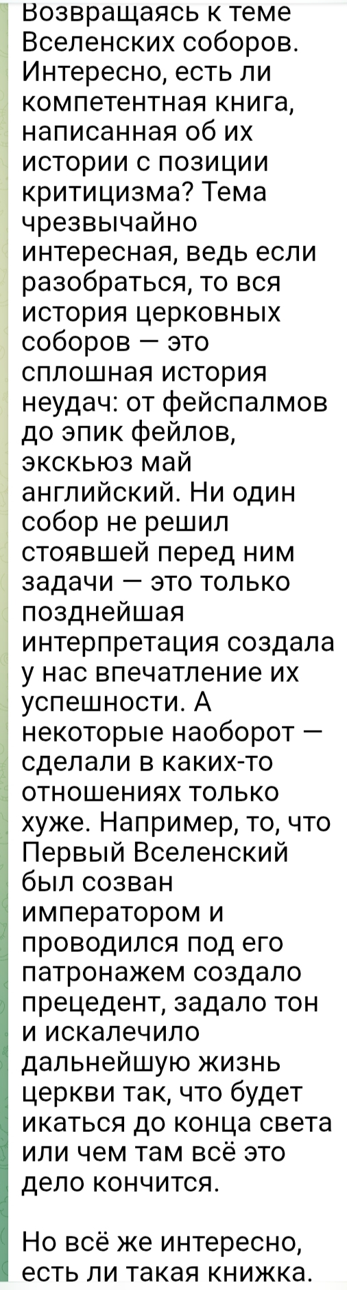 >>1164491 > Соборы. Все споры в конечном итоге решал именно меч императора Не всегда, порой набоорот так Церковь начала спорить порой что ересь что нет а император созывал вселенский собор и говорил типо "сами там разбирайтесь что канон что нет мне плевать" вроде на втором так было или не втором но на каком то так точно было > Если Соборы это сам Дух Святой, Впервые такое слышу, тут скорее Дух Святой это и Соборы в том числе а не только Соборы