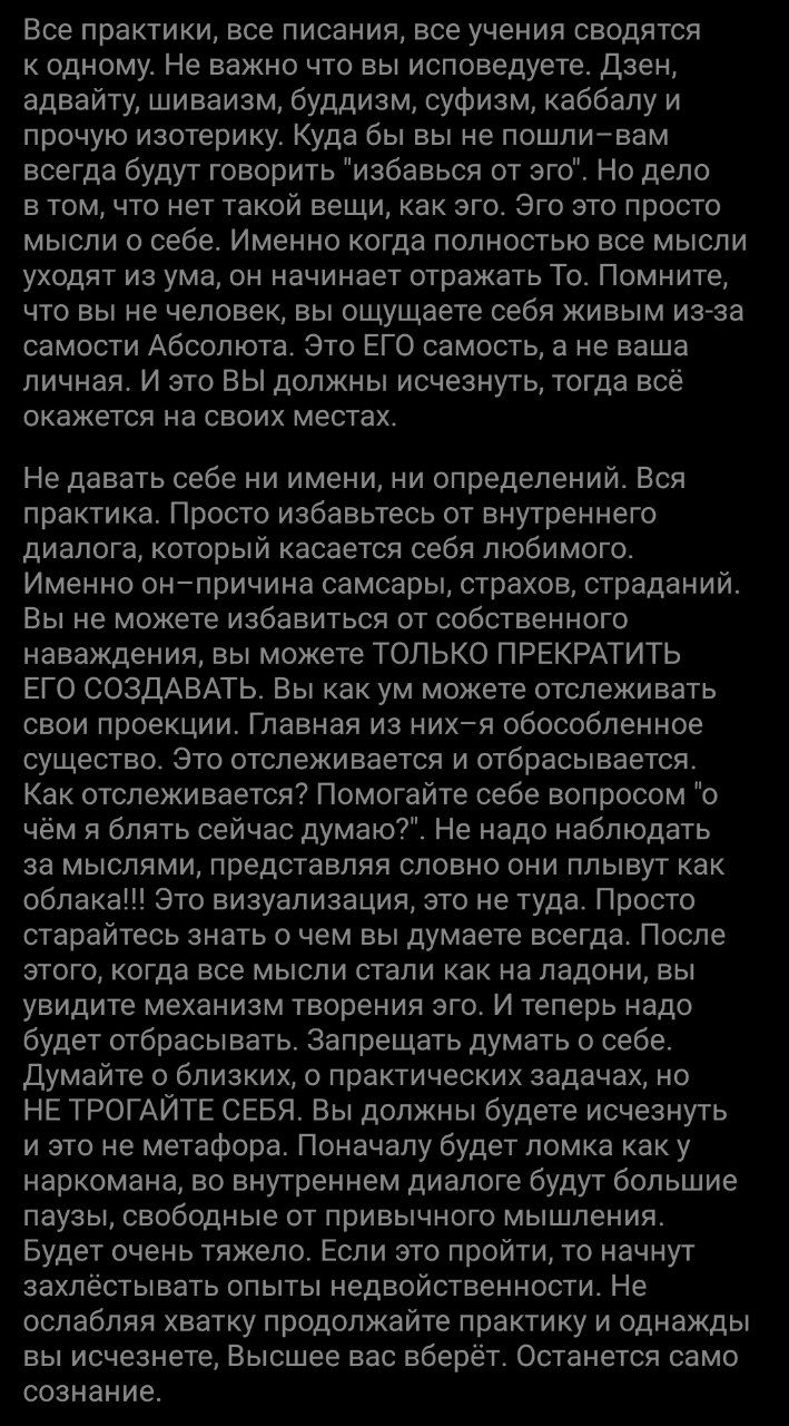 Недавно на нулевой видел такой тред (пикрелейтед). Вопрос: достаточная ли это по своей полезности практика, чтобы прийти к просветлению? Также здесь советуется «помогать себе вопросом "О чëм я сейчас думаю?"», однако, как правильно это выполнять, уж если это хорошая техника? Допустим, я что-то подумал, а затем вспомнил об этой технике, задал сей вопрос — и что же? Я ведь легко могу и повторить сам для себя свою мысль, уже только что умственно проговорëнную. И так же легко, получается, могу и продолжить тот же умственный нарратив. А зачем тогда я себя спрашивал, о чëм я думаю? Ведь этот вопрос не является инсайтом, вроде того, что я не могу знать, о чëм я только что думал — ведь я действительно знаю, о чëм я думал, уж если я думал об этом буквально только что.