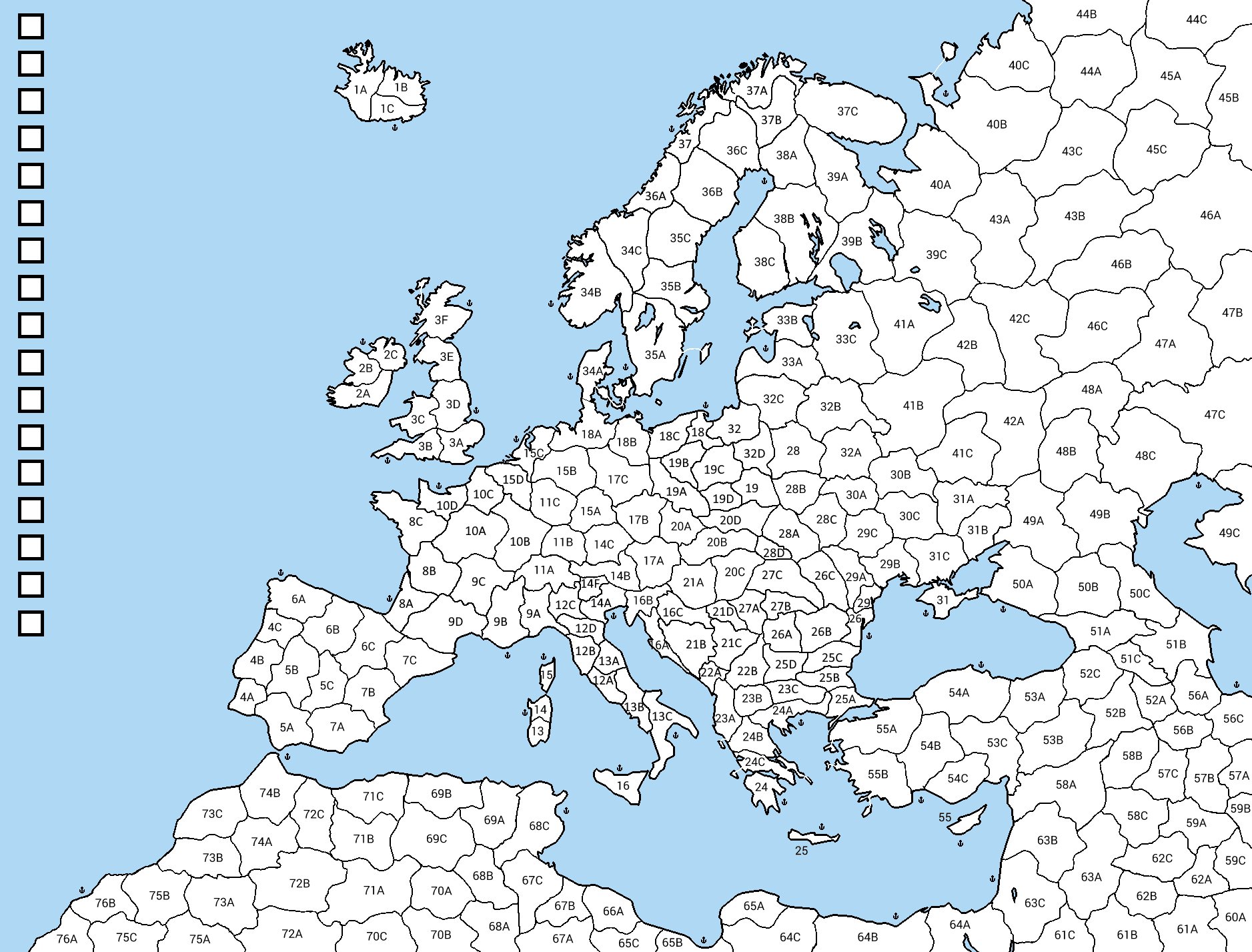 ПРАВИЛА: 0) Игра начинается после создания минимум 3 стран. 1) Государства создаются бесплатно. Можно назваться своею аватаркою-правителем. 2) При создании государства обязательно жирным указывайте название, стартовую территорию и цвет (черный, белый и моря – запрещен). 3) Государство создается с одной территорией. Новое государство начинает роллить со следующего хода. 4) Захваты территории проводятся при помощи броска кубика ## 5d9 ## (без пробелов). Последняя цифра в скобках показывает количество захваченных территорий. 1–3 = 1, 4–6 = 2, 7–9 = 3, 0 = 0. 5) Присутствуют бонусы к захватам. Дабл — +2, Даблодабл — +3, Трипл — + 4, Квадра — + 6 территорий, даблотрипл\триплодабл — +5, пента — +12 к количеству захваченных территорий. 6) 666 — ЯО. Превращает 10 территорий противника в нейтральные. 7) 777 — защита от ЯО. 8) Обязательно выделяйте свой ход жирным. На выбор ОПа ничего не рисуется, пишите номера клеток. 9) Не ролльте жирным. 10) При выполнении любых действий пишите название страны, за которую играете. В противном случае ОП не обязан ничего учитывать. 11) Обязательно использовать жирный для выделения выпавших вам бонусов, действий, обращений к ОПу. 12) ОП обращает внимание только на жирный шрифт. 13) Из порта можно захватить другой порт. 14) Дипломатия существует. Вы можете создавать конфедерации, альянсы, заключать мир и много ещё чего, всё ограничивается вашею фантазиею. 15) Без столиц и укреплений. Восстаний нет. Накапливать даблы запрещено. 16) Последний ход около 500-го поста. После 500-го перекат в другой тред. 17) Передавать часть территорий можно. 18) Нельзя создать государство впритык к другому государству за исключением случаев отсутствия свободных территорий. 19) Передавать роллы нельзя. 20) Если выпал 0, сообщайте об этом. 21) Если уходите, то сообщите об этом, уважайте остальных.