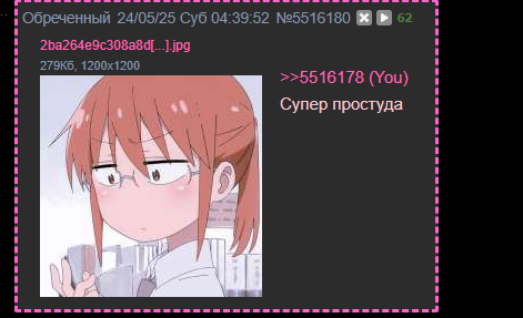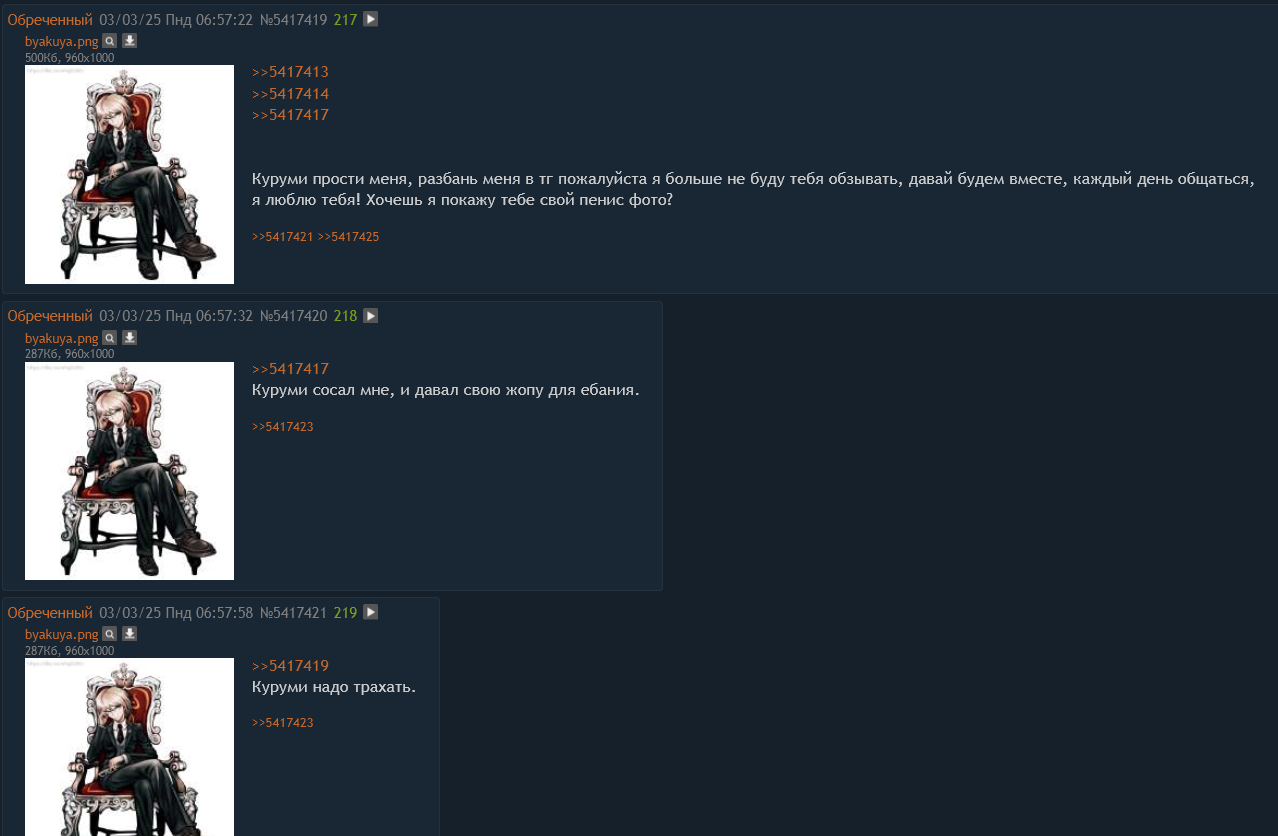 Ничего личного. У меня параноидная шизофрения и общая заебанность от людишек и этого места. Где мне и суток не дают спокойно посидеть - высираются и начинают пытаться травить.