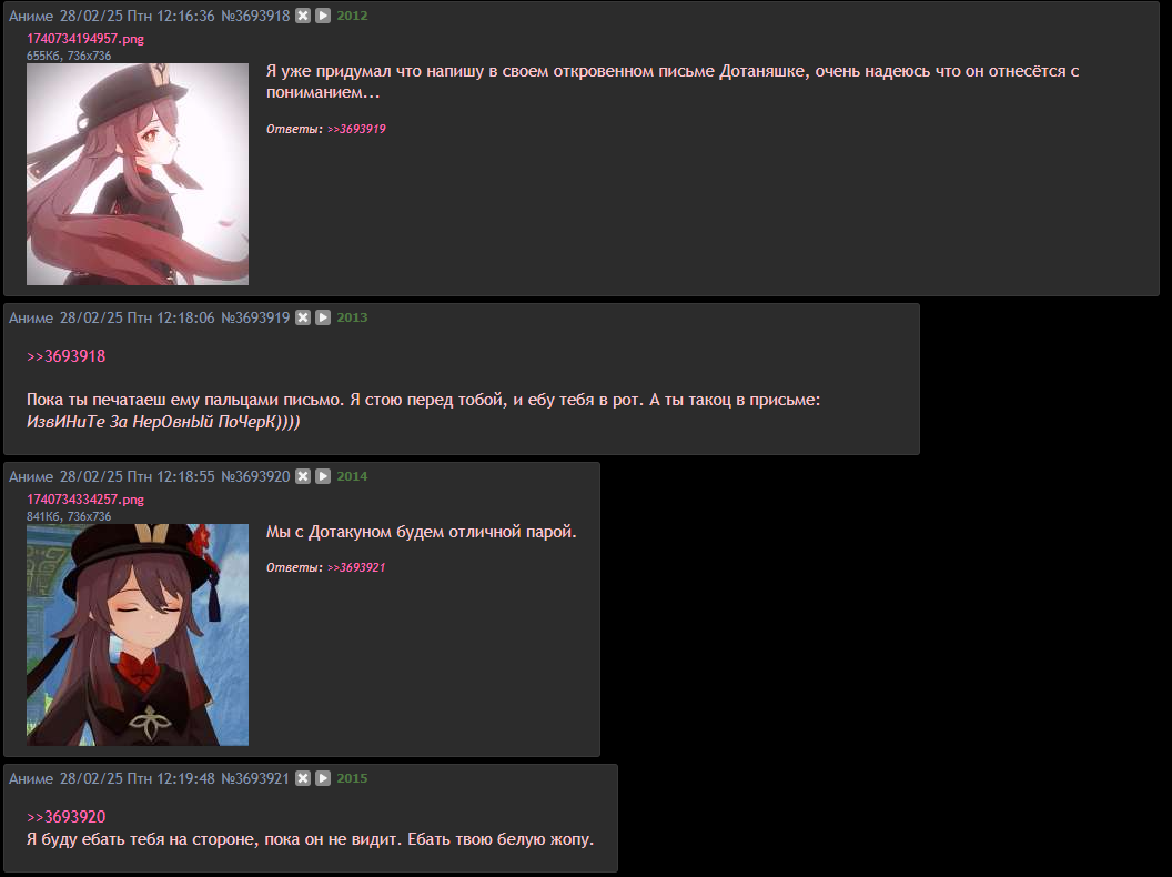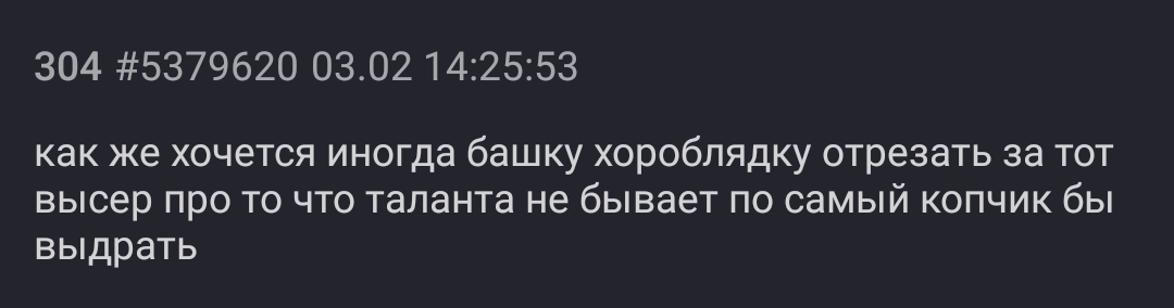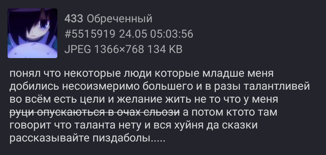 Нормис-неудачник провалился ИРЛ по всем фронтам и высрался в /rf попытать удачи здесь, но и тут его настоящие хикки вроде Доты макнули лицом в дерьмо, и омежное чмо просто не может успокоиться и исправно заходит в ХТ протыкаться попой о член Дотахикки.