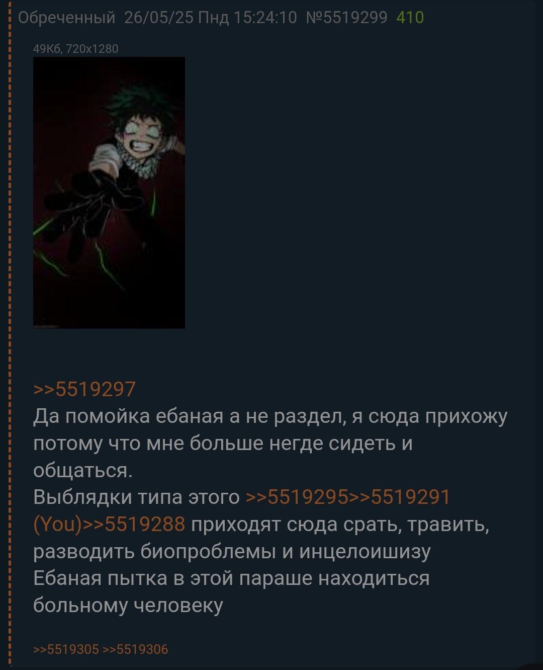 >>5519353 ок, травилки никогда не меняются, точно так же как и в любом калективе. тут примерно 1% того что ожидает нас ирл в среде нормотЫ > занимались ававорством интересна когда им сильно не злоупотребляют, а так постинг сваливается в кашу > Хикки-тред и Титокер заходил и срал у нас не хочу писать о нем ничего, тотальный игнор лучшее что может быть Не навижу срачи, не могу конфликтовать и целенаправленно переходить на личности, чтобы кого то заспамить нормисными оскорблениями. > Калпуста и Нажрин сплетни ирл? тоже мимо, обсуждение срачиОнлайн еще куда не шло, а тут соц натуральный
