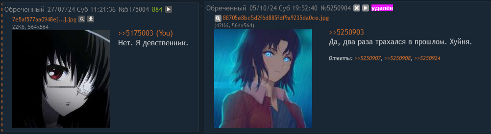 >Паксил кстати помогал от этого, под ним ничего подобного не было, правда он овощем делал. Я честно не понимаю, почему ты настолько хер на себя забил. Точнее нет, не забил, ты жалуешься постоянно, но взять яйца блять в кулак сжать и один раз к врачу сходить (если надо) не можешь Тут я не обвиняю тебя а пытаюсь сказать что у тебя вообще не те приоритеты Вот я забил абсолютно на то что у меня с зубами а за то время которое я буду тянуть может дойти до совсем чего-то хуёвого Впрочем мне всегда было плевать на здоровье но это уже другая история Тебе же возможно лучше без всех этих эмоций быть потому что они тебя буквально убивают >Которые я запостил, и они исчезли так быстро, что никто и не заметил, включая меня (когда отправил второй пост, только тогда заметил что первый пост утонул, то есть не было возможности остановить отправку второго поста, ну и естественно после второго прилетело кувалдой). Хотя я даже не занимался т.н. ававорством - из гугла просто первые попавшиеся арты фкея скопипастил, название не пытался даже подделать какие были у фгея, то есть в чем ававорство-то, лол, но ему было похуй. Ебать. Вот это уже нихуя себе))) То есть когда я их запостил, ему было похуй? Значит ли это, что конфа под мочой и в неё входит Фкей обиженной вариации, который затриггерился на меня, но обижен именно на тебя? Ну спасибо, теперь хоть сложил 2+2, потому что тогда вообще не выкупил что это было и кого куда там потёрли. >Всё так. Только на то она и паранойя, что она может и это логически объяснить. В общем не обращай внимания, зачилься. Лучше агрись на нормисов, которые actually mean it когда пишут что-либо. Это ещё как посмотреть. Может это и троллинг всего лишь. У меня, например, теория есть, что дилдокер это тролль феноменальных масштабов. Т.е. ему на самом деле не нравятся тикток-шалавы, он их просто постит и форсит ту самую тему как часть процесса троллинга. А просто так агриться на всякий мусор - ну, я был бы рад, если бы это их выдавливало, да как-то не помогает.