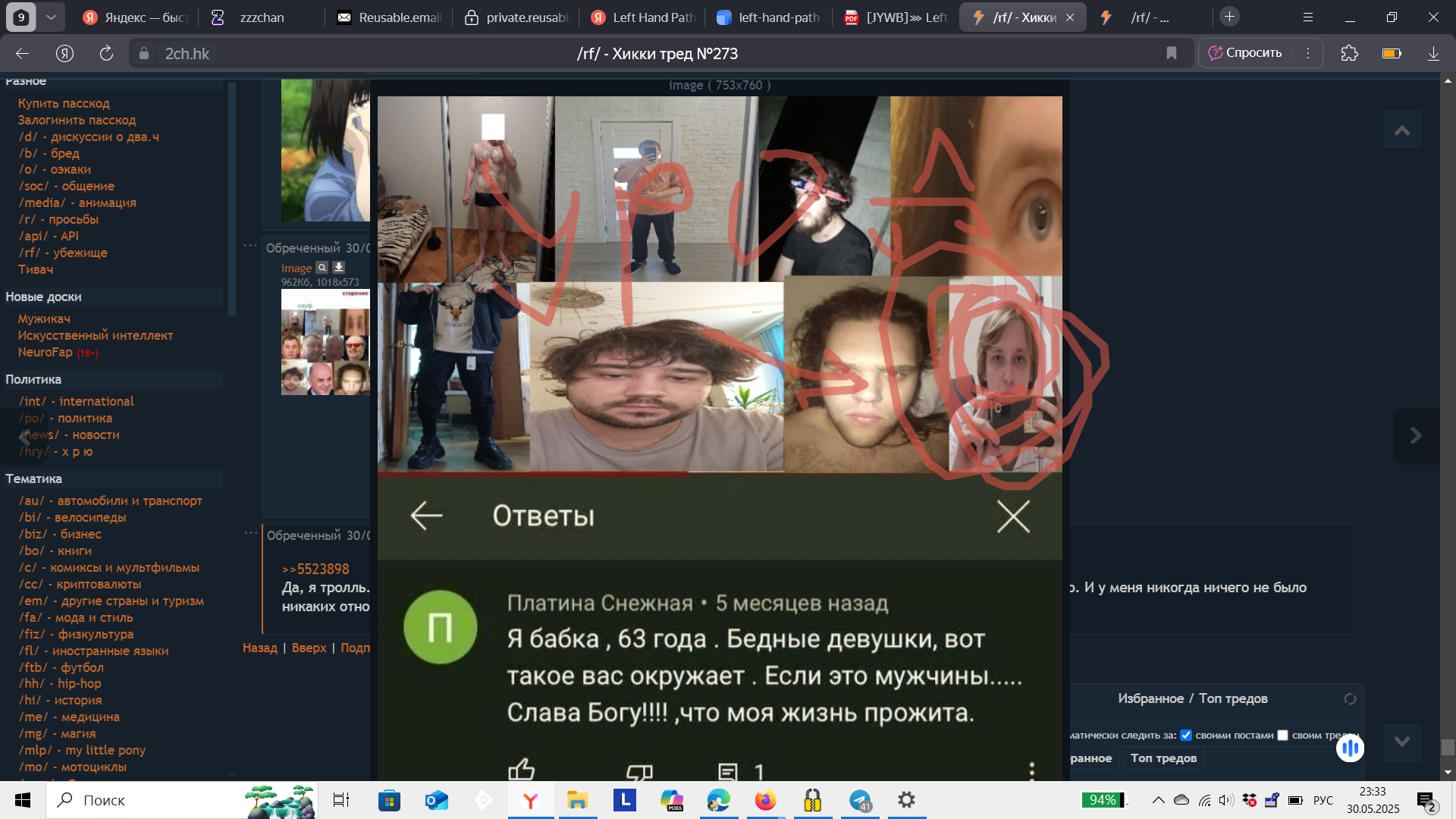 >>5524000 Потому что я безвольный абсолютно и живу одним днем от пробуждения до засыпания, постоянно находясь в ожидании что скоро умру, чувствую как будто, и поэтому делать что-либо не имеет смысла. Тут только самообманом заниматься, и внушать себе что врач сделает лучше (а не хуже, как я уверен на 100%). Я уже сдался по сути и опустил руки, доживаю последние дни по ощущениям. >Впрочем мне всегда было плевать на здоровье но это уже другая история Возможно потому что пока первых серьезных проблем не было. Зубы это зубы и всё таки даже запущенные случае лечатся и боль снимается, с остальным организмом - не так. >в неё входит Фкей обиженной вариации, который затриггерился на меня, но обижен именно на тебя? То что Фкей обижен именно на меня это как бы очевидно должно быть, лол. Мы с ним срались еще до того как вы с ним столкнулись, просто на тебя он сорвался, ты ему под горячую руку попался. Кстати, фкей известный гомофоб, это бы тоже могло объяснить кое-какие моментики за последнее время, когда тут спокойно постили хентай, но минусали анончика на нюдес с куном. Ну и что он на самом деле не выдавился, а просто снял аватарку и из под анонима ведёт борьбу и травлю меня, с оскорблениями и своим классическими фразочками, тейками, мстит исподтишка. Его борьба. И если идти еще дальше, то можно предположить что никакого Миши нет и никогда не было, что это лишь альт. личность самого фкея, та самая тульпа которая у него якобы есть. Или это таки 2 реальных человека, но они на постоянном контакте в личке и Миша очень хорошо выполняет желания и просьбы фкея. >дилдокер это тролль феноменальных масштабов. Т.е. ему на самом деле не нравятся тикток-шалавы, он их просто постит и форсит ту самую тему как часть процесса троллинга. Да, это вполне в духе и стиле авророчма. Правда, говорят он несколько лет в /media сидел в танцулько-тредах, его там знают как Хохольчика, и его там давили. >А просто так агриться на всякий мусор - ну, я был бы рад, если бы это их выдавливало, да как-то не помогает Суть не в одиночных редких постах с агром, они юзлес это понятно. Суть именно в перекрытии, когда несколько желательно постеров перекрывают норми-постинг хикки-агром т.н.