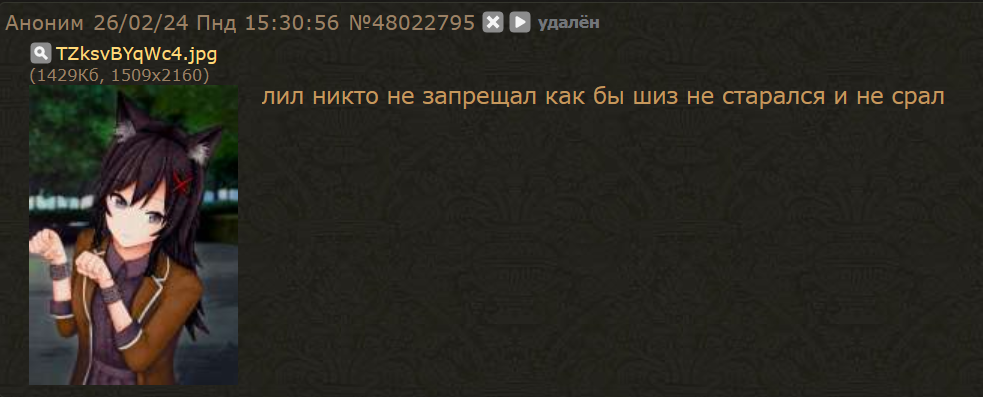 >>5526551 > Вот. Поэтому лично я всегда очень прохладно отношусь ко всему анимешному На моей памяти есть аниме, где тянки не окружают ГГ, например, какой-нибудь Атака титанов, там и кунов, и тянок одинаковое количество, кунов скорее даже больше, или какое-нибудь спортивное по типу "Волейбол!", Тетрадь смерти, Код Гиасс (его не досмотрел, еще на начале бросил, собираюсь пересмотреть, но помню, что тоже нн гаремник). На самом деле много негаремных аниме, просто это сейчас низкосортный шлак выходит и чтобы как-то привлечь аудиторию, то и добавляют фансервис. > Тянкам какого возраста нравится смотреть на тянок в аниме, лол? Нередко отзывы от тянок на аниме вижу, где ГГ-куна окружают тянки, ну в такой форме гаремника так сказать. > В принципе ты детей и подростков описываешь, или остановившихся в культурном развитии и предпочтениях на инфантильном уровне Да подростки восхищаются всякими Сон Джинву из калового аниме Соло левелинг (2 сезон кал), Сатору Годжо их Магической битвы, Киётакой Аянокоджи из Класса превосходства и другими, так что тут ты ошибся >:3 > Подавайте нам красивых тянок, в мусорку содержание Малыш, то, что ты сейчас пишешь, это относится ко многим нынешним аниме, много годных старых есть. Да и фансервисных аниме (где если тягки просто окружают куна) таких немного же. Из новых Монолог фармацевта, где ГГ - тянка и ее окружает красивый кун (и куны), и это не аниме категории сёдзё, куны тоже смотрят. Про какие-то аниме со сложными сюжетами не знаю, я такие не смотрел и не совсем понимаю какие имеешь ввиду. Фентези я в принципе не люблю, при этом большинство фентезийных аниме - это как раз фансервисный шлак, особенно, исекаи. > сериалы для быдла! Ну много сериалов быдланских есть (много не смотрел, но у меня такое мнение сложилось), особенно, у нормисов популярны раньше были наркоманские и социоблядские, сейчас не знаю. > 3д вообще для быдла!" И в чем не правы? :) Нахуй вообще эту жизнь... > А по факту аниме это японская версия того же Универа, Ворониных, Счастливы Вместе и прочего Проиграл xD > Просто желательно лучше не ограничивать себя одним аниме и выходить из пузыря в котором одни аниметян и избранные школьники-нагибаторы которые управляют судьбами миров, лол. Я и сериалы тоже смотрю, но мало. Вот скачал Бумажный дом еще год назад где-то, но не дотянулись руки еще, что-то еще скачивал, парочку фильмов тоже еще не трогал.