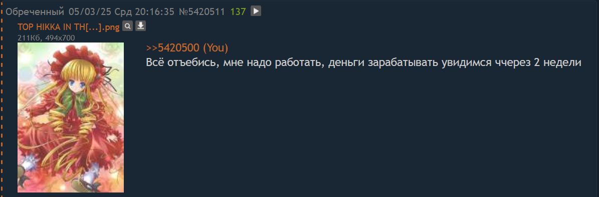 >>5526558 Так я тоже видел, но это как правило подростки от 13 до 23 лет >Да подростки восхищаются всякими Сон Джинву из калового аниме Соло левелинг (2 сезон кал), Сатору Годжо их Магической битвы, Киётакой Аянокоджи из Класса превосходства и другими, так что тут ты ошибся >:3 Шинку, ну вот ты сидишь на англоязычном реддите или 4чане или в принципе в местах скопления европейцев и американцев и т.п? У меня подозрение что ты заперт в русскоязычном пузыре -> судишь исключительно по этой маленькой выборке русскоязычных анимешников. Совсем недавно (год назад) все подростки 14-23 лет смотрели Клинок рассекающий демонов и говоря про Танджиро Камадо говорили "да это же буквально я". Не знаю откуда у тебя твоя информационная.. Но в англоязычном сегменте ютуба и реддите можно четко отследить тренды и что кто хайпит.. >Малыш, то, что ты сейчас пишешь, это относится ко многим нынешним аниме, много годных старых есть. Да и фансервисных аниме (где если тягки просто окружают куна) таких немного же. >Из новых Монолог фармацевта, где ГГ - тянка и ее окружает красивый кун (и куны), и это не аниме категории сёдзё, куны тоже смотрят. Малыш я не спорю что есть хорошее или как минимум достойное просмотра аниме, но таких тайтлов — меньшинство. И копаться в киллотонне помоев фансервиса и биопроблем совсем как-то не хочется. К тому же это и отражается на самих анимешниках. Ведь любой фандом и коммьюнити всегда определяется большинством тайтлов, определяется самой наибольшей долей жанра, и следовательно большинство т.н. анимешников и всех их обсуждений это про биопроблемы, спермотоксикоз и инцельство с вайфудрочерством. Да и на бордах это хорошо прослеживается, вот всю свою жизнь я только и видел что аниме-аватарки с тяночками из фансервисных помоек и исекаев, и лишь единицы на моей памяти аватарили чем-то приличным. >Ну много сериалов быдланских есть (много не смотрел, но у меня такое мнение сложилось), особенно, у нормисов популярны раньше были наркоманские и социоблядские, сейчас не знаю. Сериалы в отличие от аниме строго поделены по нишам и жанрам, и выбор к счастью очень большой. Рынок т.н. прозрачный, можно сразу скипать нормисный шлак и выискивать гемы для ненормисов, типа фантастических триллеров про космос. >И в чем не правы? :) Нахуй вообще эту жизнь... В том что разницы нет, лол. Та же повседневность и весь фансервис это тоже самое что и 3д жизнь, только в концентрированным виде и оформленно в 2д рисовки. Всё. Разницы нет. Типа вы создали 2д, альтернативу и.... вместо того чтобы использовать это пространство для чего-то крутого, умного и уникального, попыток в глубокое искусство, вы клепаете фансервис, пафос для детей и школоло, исекаи и гг-школьников под копирку с такими же тян под копирку. Итоги, как говорится. >Я и сериалы тоже смотрю, но мало. Вот скачал Бумажный дом еще год назад где-то, но не дотянулись руки еще, что-то еще скачивал, парочку фильмов тоже еще не трогал. Вот фильмов за последние даже 30 лет если взять отрезок, сняли гигантское количество, самых разных жанров, во всего мира. Корейские хорошие есть, и даже ВНЕЗАПНО японские, и китайские и из других стран, то есть среди фильмов даже без голливуда можно найти очень много крутых и хороших фильмов, которые не просто развлекают, а из которых ты много нового выносишь для себя. Да и даже если смотреть на голливуд и масс-маркет со