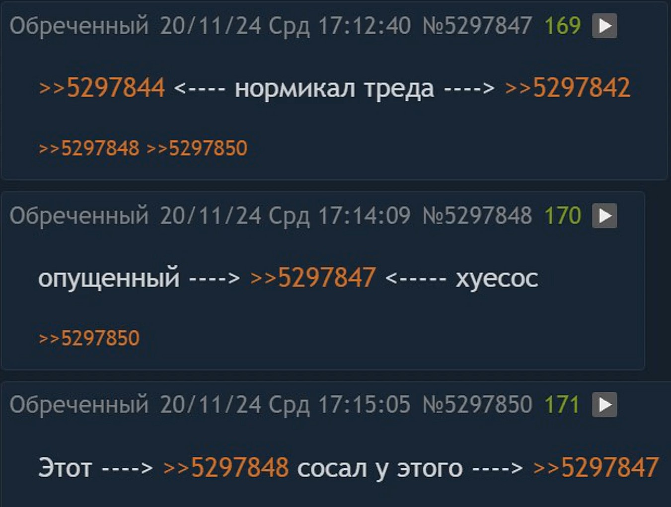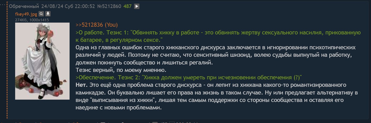 >>5528607 >Ты ведь понимаешь, что я не могу оспорить это без угрозы бана? В смысле не можешь оспорить без угрозы бана? У тебя насколько я понимаю, если это не форс хейтеров, есть настоящая жена. Пока тут сидят психически больные инвалиды которые даже в магазин не могут выйти или купить себе одежды. Разницу чувствуешь? >Соответственно, со смертью обеспечителей, хикка должен умереть. Нет, не должен. Из чего выходит сие утверждение? Из самого определения? Там ни слова об этом. "Хикками не рождаются, и хиккой можно перестать быть" - правильная логика, а вы почему-то подразумеваете что хикки это безвольный неодушевленный предмет. И предвещая фкейвскую риторику... аналогия с гопником засевшем дома, как критика "старого дискурса" сама не выдерживает никакой критики. По простой причине: ни один гопник или любой другой социк не станет сидеть дома 10 лет и "прожигать" свою молодость и "лучшие годы жизни" с 20 до 30 лет сидя за пекой. >Проблема в терминологии, как водится. Если играть от этого, хикке либо мертвы, либо не имеют права называться хикками. Ни какой проблемы нет. Вы занимаетесь откровенным словоблудием. Всё куда проще и я конкретный пример даже привел. Да, когда хикки идет работать, он уже не хикки, может называть себя затворником или экс-хикки. Да, когда девственник в первый раз занимается девственником, он уже не хикки. Да, когда вегетарианец начинает кушать мясо, он уже не вегетарианец. Что вам с фкеем не понятно? Почему вы такие гуманитарии, что вам простейшие вещи нужно объяснять на пальцах с детскими примерами? Хикки любо способен работать, идёт работать и перестаёт считаться хиккой, либо он не способен и тогда получает инвалидность и продолжает сидеть дома на пенсию. Всё. С чем ты не согласен? Вариант со смертью - редкий сценарий и как правило к нему прибегают совсем обреченные люди, которых на моей памяти в /rf не было ни одного. >Это хикке? >это хикке? Главное условие хикки это не иметь заработка и сидеть на шее (родителей/государства), а также отсутствие интереса к социуму, обществу, жёнам/мужьям, желание находиться в полном одиночестве у себя в комнате/квартире. >Много их тут? Если взять тех кто сидит на шее родителей и тех кто живет на пенсию, то их достаточно. Не так много, как хотелось бы, но что поделать, никто не станет делать раздел для хикк онли, тем более когда уже есть /rf. >Раздел для кого? Ты спрашиваешь у меня лично или это риторический вопрос? В описании раздела вроде всё написано и правила прописаны. Для кого-то это лишь формальность, к сожалению, и де-факто /rf это что-то среднее между /b и /soc и /psy. В бесконечном спокойно кучкуются заводчанине, инцелы и откровенные социки-нормисы, у которых из всех проблем это "плохая внешность". Но! Для этого и был создан Хикки тред, чтобы отделиться от всех этих нормисов. И лично я сижу только в Хикки Треде. На нулевой сплошные треды нормисов, позёров, инцелов и прочих биопроблемников, школьников и студентиков, которые заходят сюда чисто развлечься, скрасить скуку, хотя как правило все они кучкуются в бесконечном. Пока такие обреченные хикки вроде меня, сидят здесь просто потому что для них это место единственное где мы "контактируем" с другими людьми. >>5528631 Да он разбавленный и сахара в 2 раза меньше. Лучше с озона закажи из США баночку оригинальную.