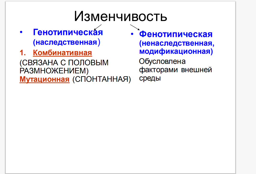 >Изменчивость живых существ имеет две основные формы: мутационную генотипическую (определяемую наследственными изменениями генетического аппарата клеток при их делении) и модификационную фенотипическую (возникающую в результате реакций организма на различные внешние условия в ходе онтогенеза) (тот же институт)