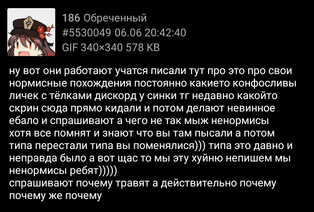 Люди из этого треда кстати почему-то постоянно кого-то пытаются травить. Как ни зайду одни оскорбления того кто первый на глаза попадется. Особенно тот кто про какооо-то гавчера пишет постоянно видно чел тащится издеваться над лругими людьми кто послабее особенно
