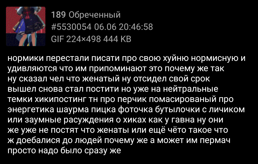 А по поводу вопроса: >А что расскажешь о себе? Трудно ответить. Невзрачный паренёк лет 23-ёх. Также как и вы работаю. Социальных связей почти не осталось, да и не сказать, что были, учитывая как быстро оборвались. Я как-то создавал давненько тред /b. К нормисам не отношусь (замкнутый, люблю одиночество), но и под хикк особо не попадаю (сыч, но вот с аниме как-то не пошло у меня, не торкнуло). Вот и сижу, туда-сюда. Где у кого что-то спросить, где у кого что-то узнать.