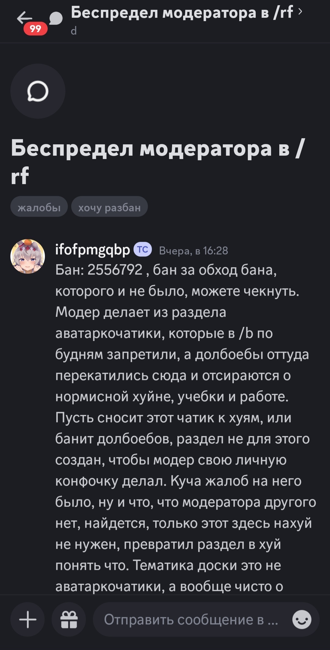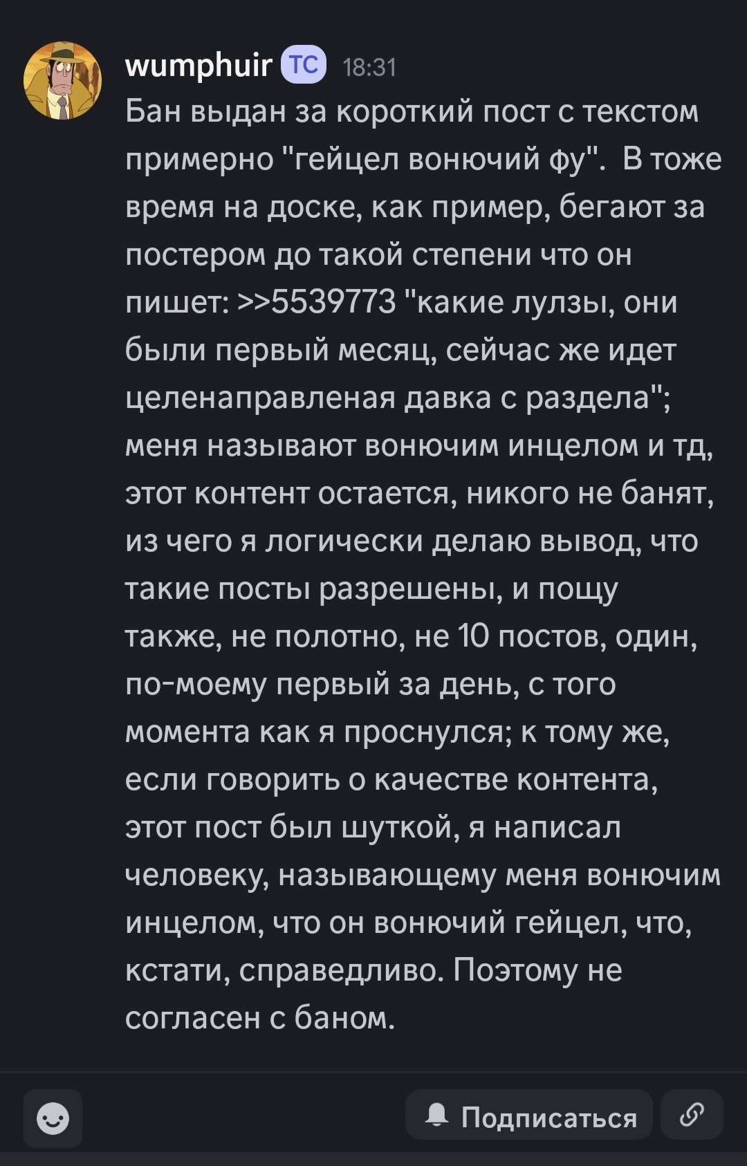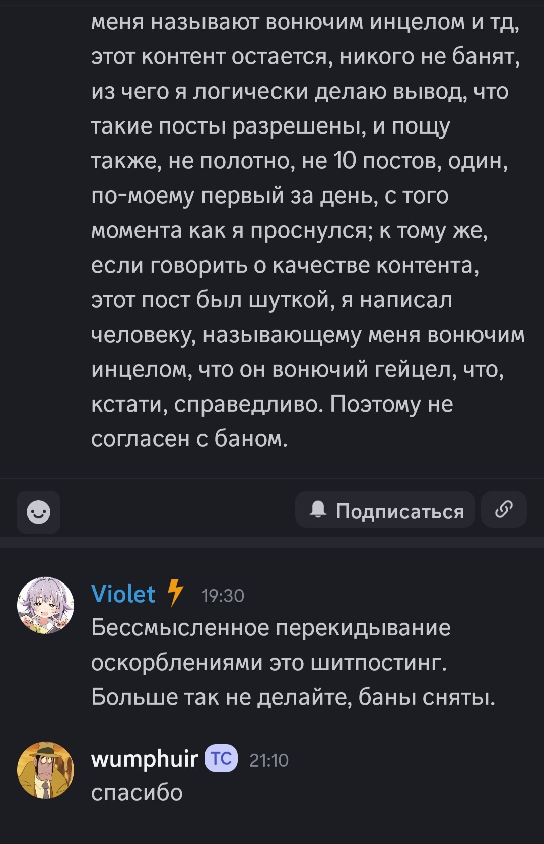 >бессмысленное перекидывание оскорблениями это щитпостинг Ого. А что, есть перекидывание оскорблениями со смыслом? Нет бы в зародыше банить оскорбляющих - не было бы и срачей никогда. Ладно, помечтали о аиб-утопии, и хватит...