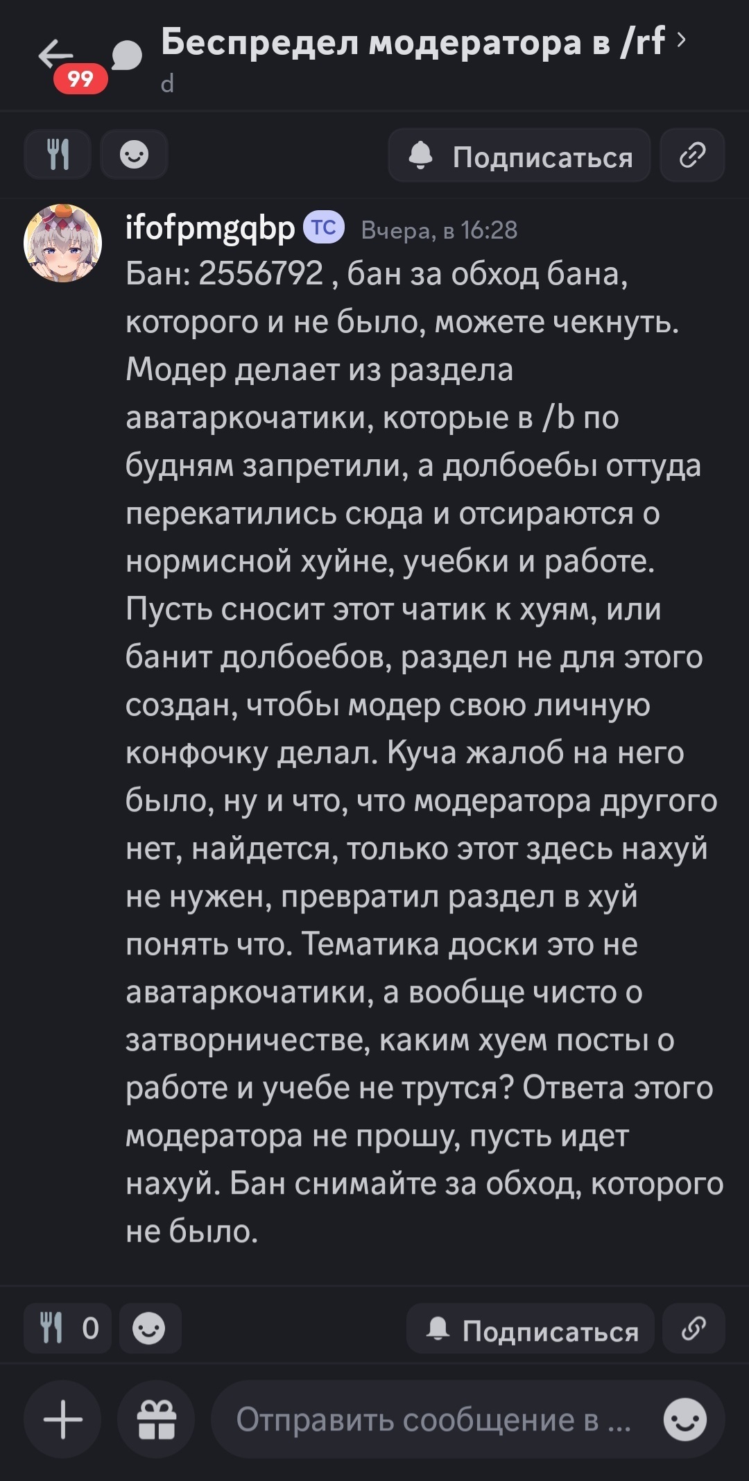 >Не совсем, записываю в необреченные скорее.. Окей, но я точно где-то от тебя видел словосочетание "психически здоровый нормис", а контекст подразумевал именно то самое. Да и вообще, это какая-то неопределённость, как и само понятие некой "обречённости", а ты это всё зачем-то в кучу смешиваешь. Я лично не считаю, что кто-то в принципе может быть полностью обречён, кроме больных неизлечимыми болезнями людей. Вопрос, скорее, в сложности выхода (при желании) из состояния этой самый обречённости. Кому-то вообще особо делать ничего не надо было бы, а для кого-то это почти неподъемно, как для тебя. В принципе, учитывая всю эту муть психофармацевтическую, я бы твоё состояние отнёс как раз почти к неизлечимым болезням по тяжести, пусть и не полностью Что насчёт Эльфа, то тут и обсуждать нечего, само собой, он не нормис Я про какому поводу вообще это всё затеял? Зачем всё усложнять и придумывать ещё какие-то классификации, обречённый, необречённый? По-моему достаточно и по нормисности оценивать. Хватит и критериев нормис/ненормис, хикки/затворник/норма, социк/несоцик. Не люблю лишние переменные просто, как и ненужное усложнение систем. Тех, кто травлей занимается здесь, я бы просто перебанил пермачом, ну или давал бы именно ИМ, разжигающим срачи, баны на недельку или дольше, но этого никогда не будет. Следовательно, что-то ещё говорить излишне