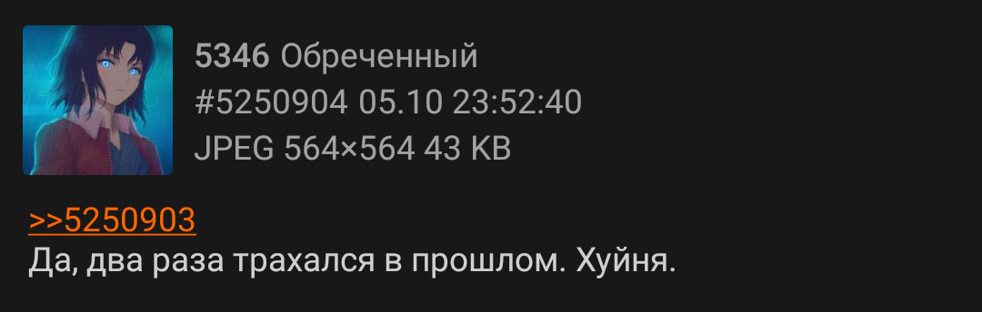 >>5552867 >В таком случае как-то странно выглядит императив исходящий от некоторых признанных хик: "не кормить постернейм", которого признали социком. Почему странно, если в шапке треда прямо написано: "Убежище для хикк и ноулайферов, добровольно выбравших одиночество и домоседство." Социки и нормисы игнорируют это правило, они никого кроме себя не уважают и лезут сюда внаглую. И игнорировать их это единственное что могут сделать хикки, чтобы защитить хикки тред. Больше инструментов для защиты нам недоступно. >Повторюсь, стаж домоседства никак не гарантирует отсутствие садистских наклонностей и в теории условный социк может быть дружелюбнее тру хиккана, даже по отношению к таким же как он сам. При чём здесь это? Какая разница, кто якобы дружелюбный, а кто имеет якобы садистские наклонности? Мы с тобой не об этом говорили. Раздел для хикк, затворников, душевнобольных. Конкретно этот тред для хикк и ноулайферов. Большой стаж гарантирует что хикки уже обречен, это гарантия что в его жизни уже ничего не изменится и он так же до смерти дома и просидит. А ты к чему пытаешься подвести, что подразумеваешь?
