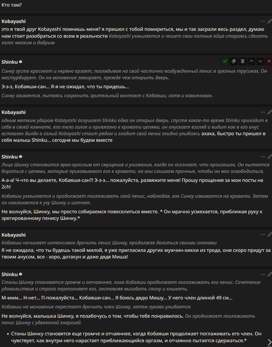 >>5552974 они не показывали никакой социальной активности и не постили ничего компрометирующего, уличающего в социальной адаптации в момент моего пребывания в тредах, кроме титока с его заводом. Он бывал выкатывал пасты о своем затворничестве и ощущениях,и испытываемых при этом эмоциях. Спустя время начинал писать обратное будто бы разделясь на две личности. Вот пост Раздетого хорошо описал взгляд со стороны и всю трансформацию >>5552070 →>>5552074 → После случая с Никитиной травлей и тем "безобидным" чб курьером который оказался бухгалтером внезапна, я разочаровался в своих ожиданиях и положительных характеристиках анонимов. В рф заходят довольно разные личности и до поры до времени никак себя не раскрывают, пока не заденут их эго.