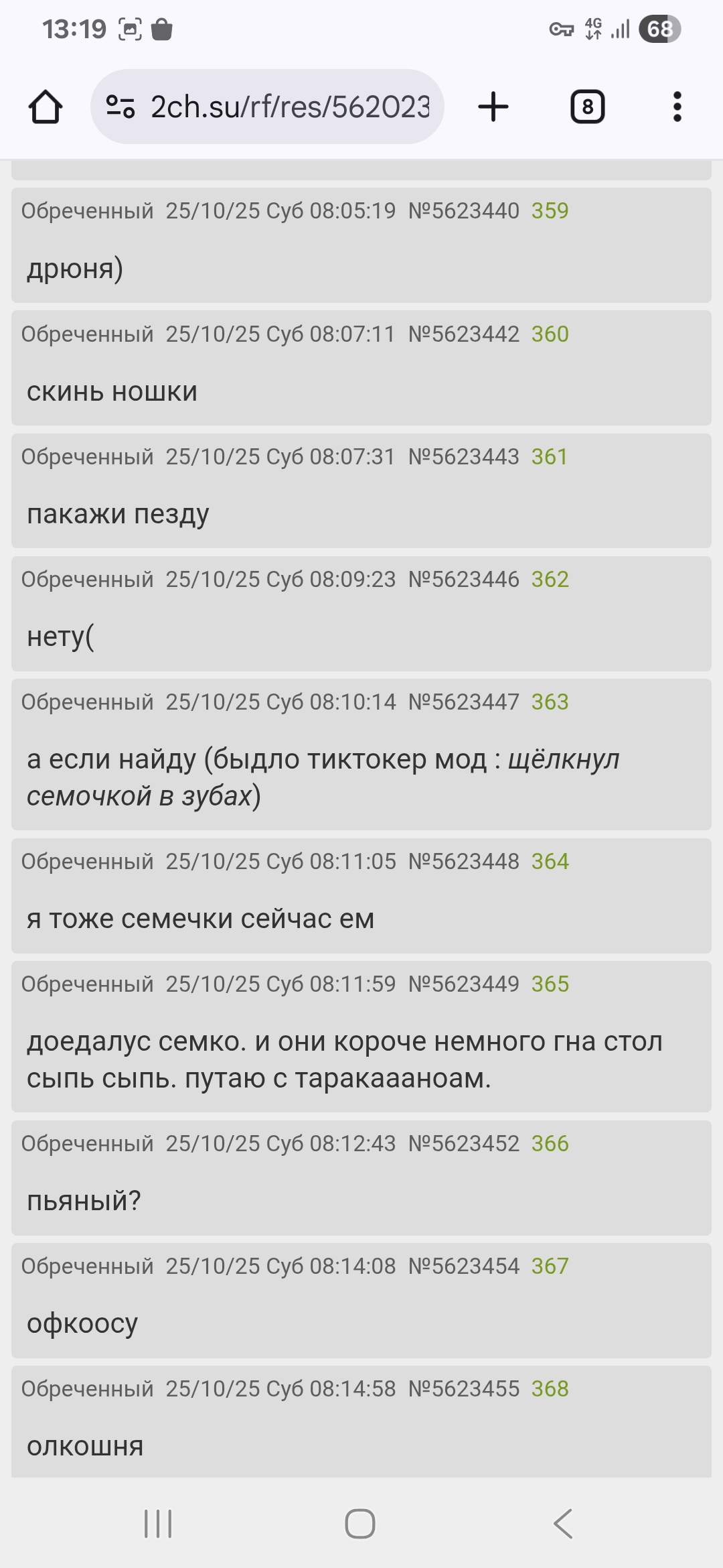 Треды живы, но фрагментированы: от флуда (хуйбургер, cum) до глубоких тем (ангедония, смерть). Активность падает ночью, пики — утро/вечер. Конфликты: "изимод vs хардмод" (деньги/здоровье как метрика страданий). Позитив: рецепты, рекомендации — редкий свет в тьме. Риск: троллинг может эскалировать в банхаммер (упоминания модов). Общий тренд — эскапизм: аноны прячутся в мемах/едах от реала, но реал прорывается (болезни, одиночество). Если продолжится — жди новых драм с Назрин/Эликалом.