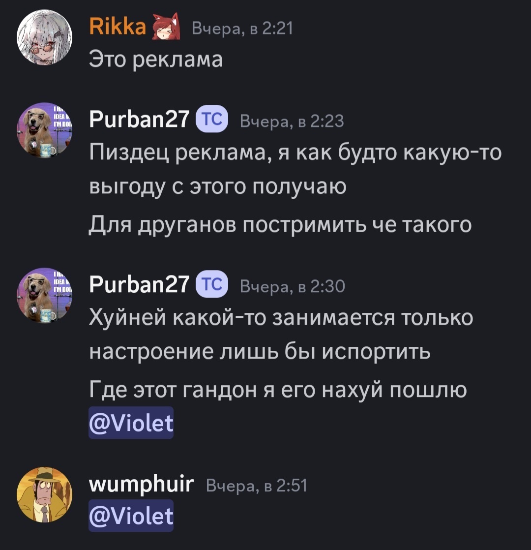 Понятно, посмотрим что здесь будет через месяц или два. Нет я не ухожу идти мне некуда понимайте как хотите, все равно. Аватарить вниманиеблядством не буду больше. Ничего нет кроме срачей и выписываний в нормисы или срачики. В лохушатнике тем более смысла сидеть нет никакого, и я не вписываюсь никуда. сейчас я максимум ананимка в ридонли, всем похуй язнаю , но напишу тем другим чтобы было понятно. я тут и никуда не пропал, прост не аватарю больше. не нада ничего спрашивать. Узнать судьбу аватрок и как у вас дела я смогу итак, без вниманиеблядства, а помочь вам никак, ведь я никто без своих попечителей