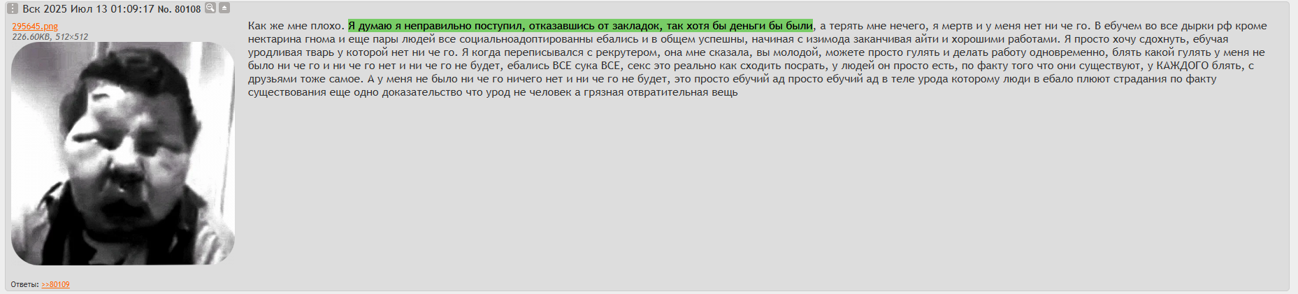 Да ладно бы у него были серьезные проблемы, типа чтобы он даже на бытовом уровне с трудом функцоинировал. Так идиот в дайвинчике сидел, кладменом хочет устроится. У дегенерата буквально 0 реальных проблем в жизни.