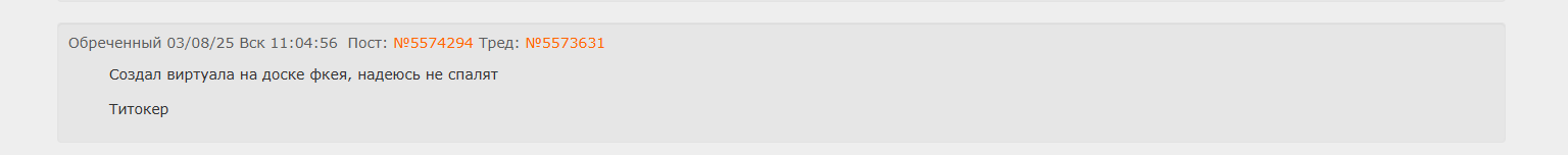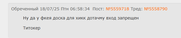 >>5574841 Очевидно, просто уточняю. К чему ты это написал? Начал меня "говнить" враг хикки треда и всего /rf, из-за которого и позволили создавать отдельные треды-чаты, его имя кокер, и он после того как узнал что фкей создал свою борду, каждый день писал что доту там будет фкей банить дота травитель хикк бла бла бла, и конечно когда он увидел меня, у него оторвало задницу от гнева. Это гнилой беспринципный социопат и провокатор, он и раньше стравливал постеров лбами, делал набросы и много чего еще. Настоящая чума раздела. И вот ты намекаешь что якобы это заслуженное "превентивное" говнение было, а не бугурт отовсюду кикнутого социка-психопата, который живет тем что травит меня. Или это ирония была? Вроде очевидно даже тебе должно было всё стать, но ты написал будто бы они заслуженно меня говнят за какое-то якобы грядущее говно от меня. Что это нафиг было?? Ммм? Какое от меня "говно" в принципе? Это всегда меня первым задирают быдланы. И вот пруф был