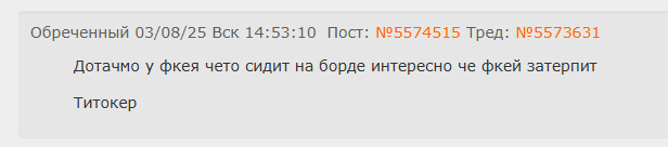 >>5575221 Покажи, где он попущен, ты высрал 1 пост после чего слился вот тут >>5575163 Дальше только ты сосешь никиткалу и заглатываешь ему по самые яйца, а Дотахикке боишься реплаить. Это у трусливых быдло-гопников и считается за "попуск"? 🤣 Как-то странно общаться с коллегой-инцелошизом и таким образом "попускать" своего обидчика. В этом заключается твоя Истина - пребывать в манямирке? 🤣 Понимаем.