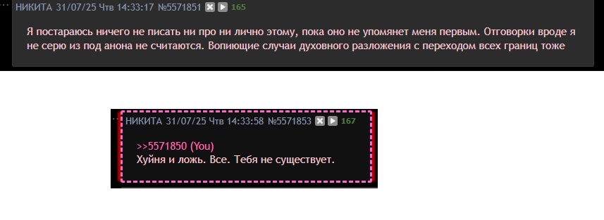>>5574952 Пруфов от него нет и быть не может, это патологический пиздабол. Я никогда не писал такого. Писал всегда ровно обратное, что травля - недопустимое, и что травить "за дело" так же недопустимо. Он порвался с того, что когда он игрался в уникального страдальца и чуть ли не мученика и его единственного травили, я ему написал что тут в разделе, в школе травили практических всех включая меня самого, и что никитос вовсе не уникальный страдалец. Вот после этого он начал свой лживый форс что я якобы считаю что "травля это норма". Это нарцисса не выдержило факта, что он не самый уникальный и не самый мученский и многих травили гораздо больше чем его, то те не ныли, не устраивали из этого шоу и представление. А он просто лживый вниманиеблядок, еще и очень агрессивный, как бешеный кидается.