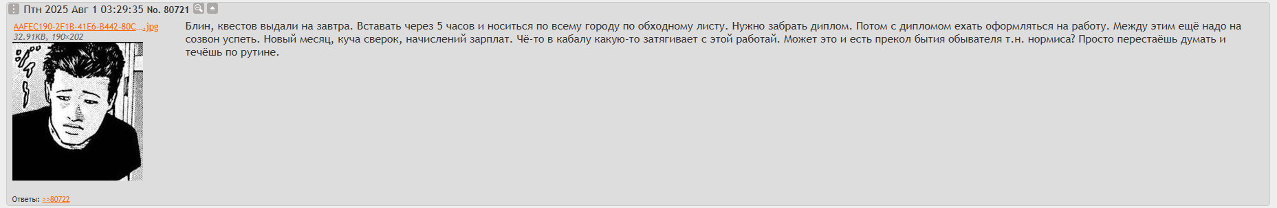 >>5575350 Да, это печально. Но заводо-быдло, сюда не ходит. Оно покупает новые тачкисредняя зарплата от 300к, ебёт баб, и бухает. Инцелы социки, ноют в своих инцельских тредах. А нормисы... на дваче есть нормисы? Ну а я, тупо алтфак, который решил заглянуть к застенчивым братишка, и спросить КАГДИЛА.