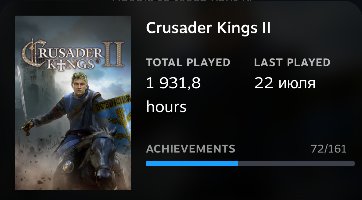>>5588423 >у меня около 2к часов в крестах, половины ачивок нет…. Уф.. Ну это из серии хойки, европки, стеллариса, так что неудивительно.. Плюс ты наверное специально за ачивками не гонялся.. >патчи ставил? русский текст? Нет. Нет.. Там элементарнейший английский вообще..