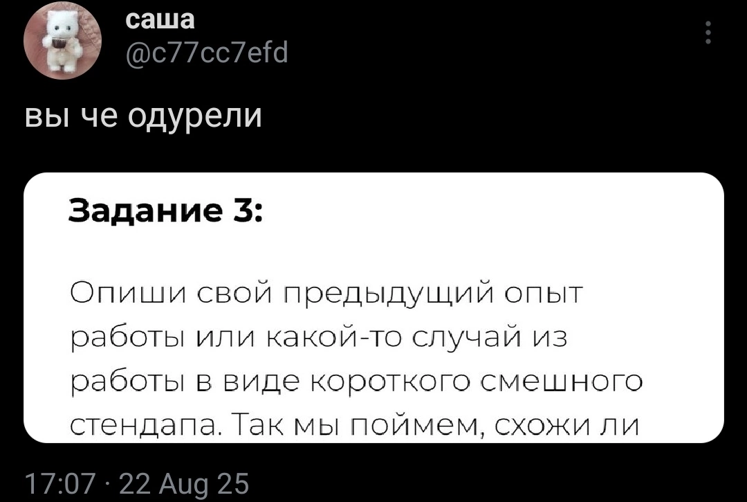 >>5588475 я смотрел ролики дноРабот от сычей и их рассказы про собеседования, потому что на мне висит домоклов меч. Конечно интересовался этой темой ходил по комнате и бил подушку моя реальность которуя я временно закопал. Прошло десять лет, а ощущение будто бы вчера был на практике. Так и еще пять лет пройдет и все пизда. Об этом нельзя не думать.