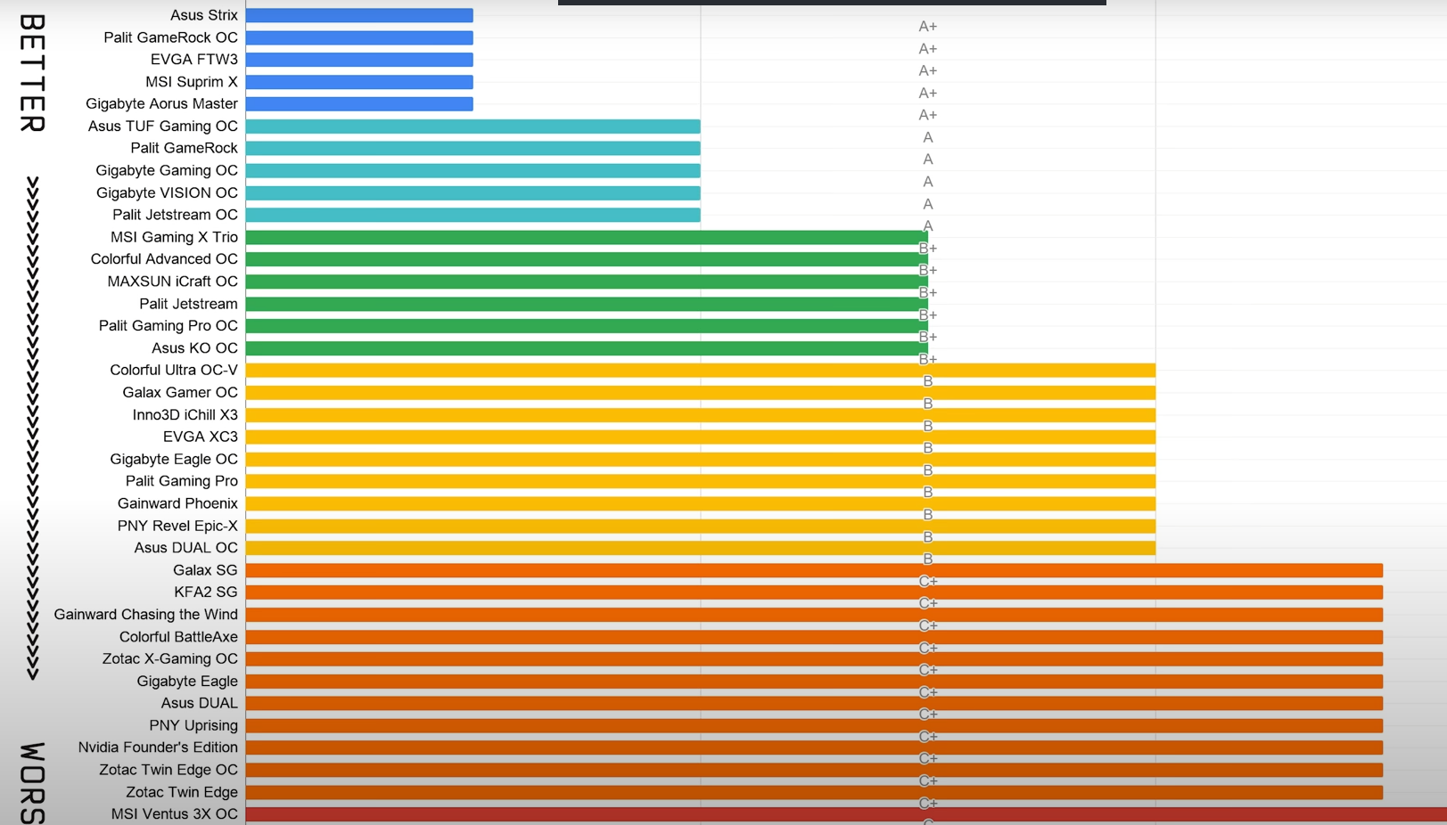>>5592442 Ой, не тот тамбнейл, вот.. Подобные тирлисты, в них сравнивают охлаждение, энергопотребление, частоты и т.д. одной и той же модели но от разных вендоров.. Поэтому легко искать топ среди своей модели и стремиться купить именно его.. Вот на втором скрине особенно, одна и та же модель - 3070, но сравнение вендоров..