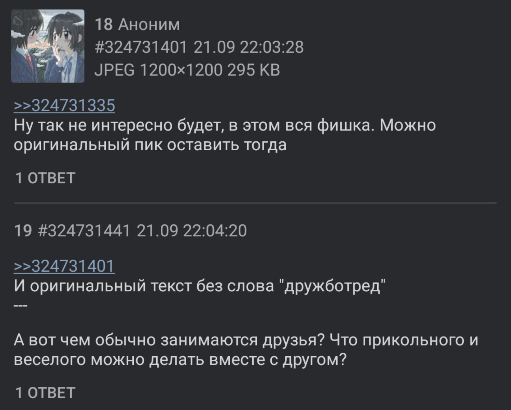 Вообще чатик случайно начался с 11 сентября, с треда и такого ОП поста >>5602178 Я запостил ответ с лёгким намёком на гомоеблю и прикрепил пикчи >>5602180 Обитатели b возбудились на целующихся девочек с членами и начали натурально сношаться там - уж очень им понравились дружеские обнимания и целования, которые я упомянул в своём ответе на вопрос ОПа. Моча должна была стереть тред, но он взлетел до 600+ постов. Это дало старт, треды создавались один за другим. Некоторое время нормально чатились по выходным без сношений, но с дружескими ласками так сказать. Ну и ожидаемо появились хейтеры и стали там срать, вот мы и сбежали сюда пока что.