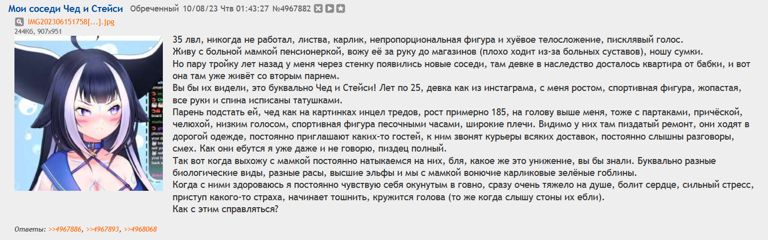 >>5676886 Да, было такое, из-за этого сорвал, они мне кажется под веществами ебались в тот раз. С тех пор они что-то сделали и их больше никогда не было слышно, ремонт какой-то наверное, спальню перенесли, кровать диван старый выкинули, может шумоизоляцию сделали. Только соседка не няшка, а солевое быдло, постоянно орёт матом, голос ниже чем у меня, изрисована партаками с ног до головы, скоро уже на лице себе бить будет как полина фейс. Твои фигурки?