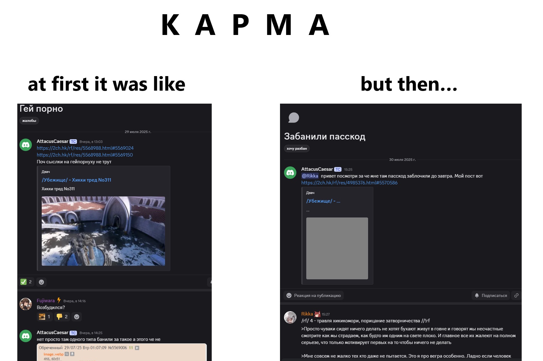 Вот есть милые и затравленные постеры - люди очень сильно себя не любящие. Они могут быть как такими как я, тихо хнычащими про себя о своих проблемах, а могут быть и с другим складом мыслей и ума. Отличным от такого как я или кого-то еще. Люди пребывая в подвешенном состоянии могут начать, чувствовать пустоту или бесконечные угрызения своего Эго или совести, либо же стараются отвлечься заменить свою слабость даже в таких местах, как уютный хикки-чат(для меня оно очень уютное место). Классический злыдень сначала всегда бывает жертвой, на сколько я могу судить имея опыт только по художественным произведениям. Что-то я немного поддался эмоциям.