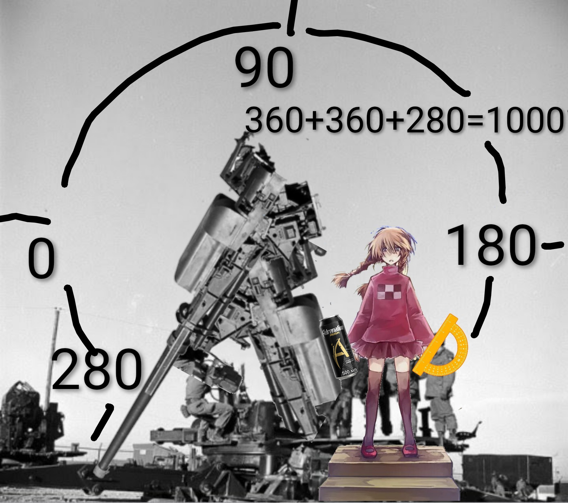 Я не сплю вторые сутки. Я зря вчера вечером выпил энергетик. Мою голову кратковременно посещают гениальные мысли, а я их быстро забываю. Я придумывал какие-то интересные вещи и быстро их забывал к сожалению. Артиреллисты используют 1000 градусов вместо 360, возможно именно так, но допустим, что 1000° это вместо 90. И вот меня призвали в артирелисты, не спавшего 2 дня, и я с транспортиром захочу использовать артиреллийские тысячно-градусные уставные инструкции на транспортир с вертикальным углом 90°. Допустим я захочу прокрутить орудие на все вычерченные на транспортире градусы орудия. Я начну его крутить на 1000°, прокручу его 2 раза по вертикальной оси и не докрутив до третьего, финальный угол наводки у меня будет 280 стандартных градусов. Получается, находясь за оружием я накручу угол наведения ствола орудия прямо в землю перед собой. Более понятно я проиллюстрировал на первом пикриле. Если произвести выстрел на испорченной мной гаубице с вертикальным углом наведения на 7 часов, то выстрел и детонация её осколков уничтожит меня и саму установку, комбат будет в ярости. Невыспанный мозг работает иначе, в тёмное время суток, такое состояние я называю найткорным дофамином, но если не спать дольше, то к состоянию добавляется недомогание и явное нарушение речевых и особенно когнитивных функций. Не могу лечь спать до наступления темноты, ведь тогда я ещё сильнее нарушу режим сна и восстановить его будет намного сложнее, я жду наступления темноты. Возможно допью свой амитриптилин, нужно где-нибудь достать новый. Творчество душевно-больного, я написал это, чтобы развлечь вас, в целом я в апатии и агедонии. Будьте счастливы, всегда высыпайтесь и не пейте энергетики в 9 вечера (*^3^)/~♡