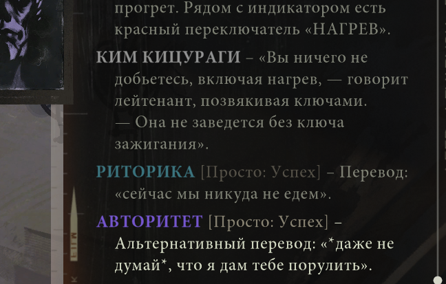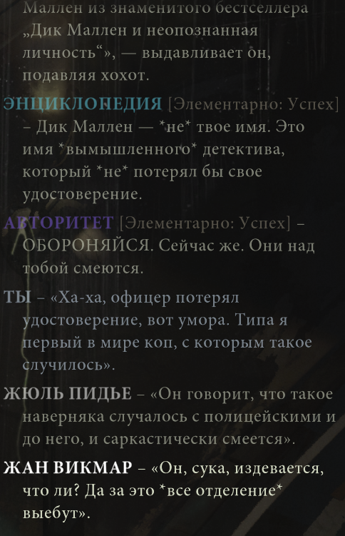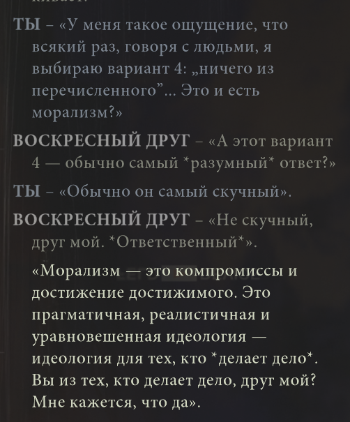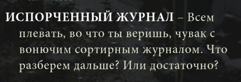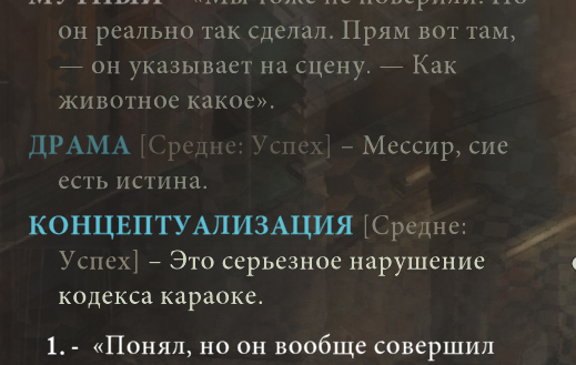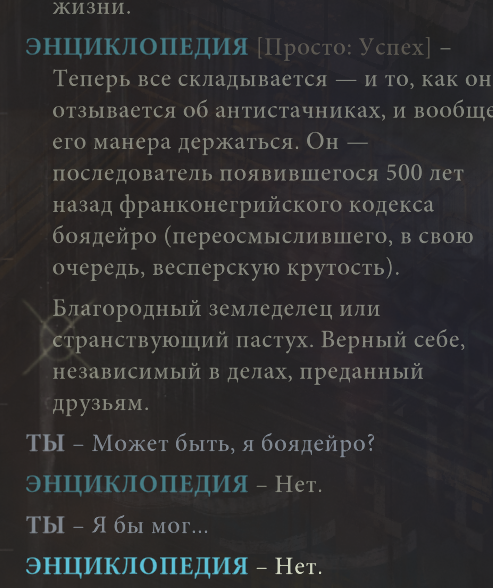 А ты не замечал что игра душное дерьмище в помоях с алкашами. Еще и зачем то дают выбирать персонажу характеристики которые даже не принадлежат ему он просто с ними разговаривает 0 отыгрывания