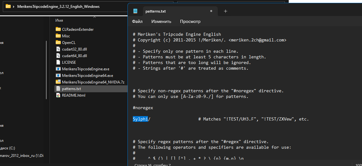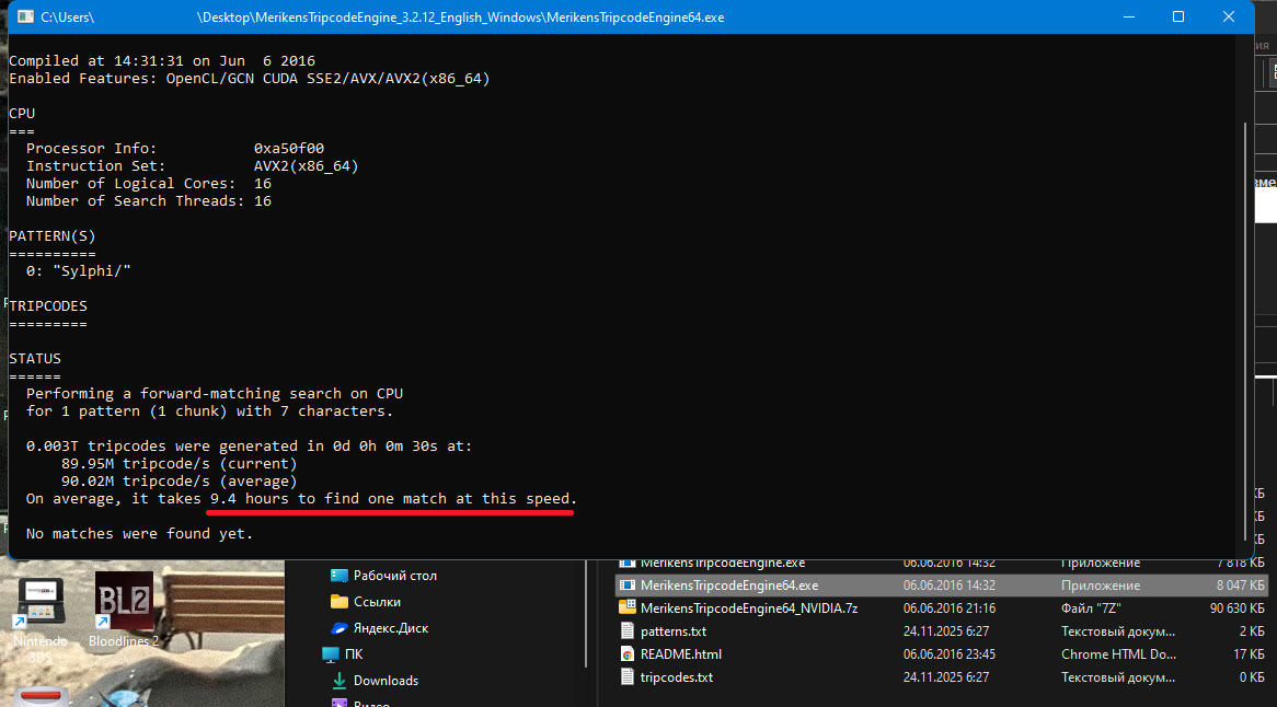 >>5643100 Там не сложно, Ушк. Скачай MerikensTripcodeEngine_3.2.12_English_Windows по линке ниже https://github.com/meriken/merikens-tripcode-engine-v3?tab=readme-ov-file#downloads Распакую в одноимённую папку. Найди в ней текстовик patterns (или patterns.txt если не скрыты расширения файлов в настройках). Напиши вместо TEST в начале что то своё, например как я на пикчах и сохрани текстовик. Потом запусти MerikensTripcodeEngine64 (или MerikensTripcodeEngine64.exe если не скрыты расширения файлов в настройках) Сиди и жди пока он намайнит тебе искомое. Можешь что то своё. Можешь вообще просто запустить. Будет быстрее но слишком рандомно. Ничего сложного в общем. Только вводи не то что он пишет а то, что начинается с решётки. Вставь это в поле Имя и вуаля - у тебя есть трипкод. Там правда ничего сложного. Я давно уже думал тебе подсказать это всё. Проц только греется, но это мелочи.
