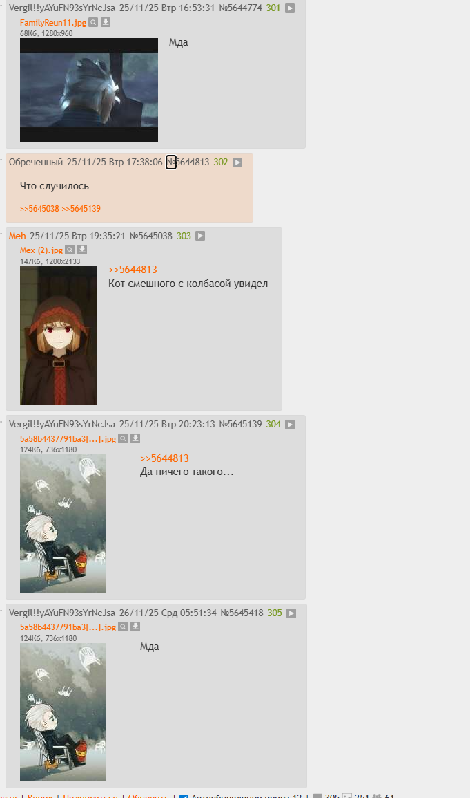 >>5645694 > знаю его по мемсикам и все на этом, как и груз200. Нефтеняная культура без красивых фантиков. Суровый и неожиданный фильм с шикарными видами уровня Фикеевского портового городка. > они короткие за пару дней прослушаешь. Займусь, как переварю увиденное сегодня в Бибопе и наплаваюсь в Кораблях. Возможно попробую уйти в эмуляцию PS3 там постоянно обновы прилетают, Splatterhouse BLES01120 очень доставил, вдруг допилили. > Про лес на холме ничего не знаю. https://rutracker.org/forum/viewtopic.php?t=6527764 Чувствую там будет что то про друидическую бретонию. Первой начну. Интересно десу. > дропнул, рисовка и вайб не зашел никаким местом, но бвла альтернатива в виде ушастых в галактике, с тактическими звездолетными боями. Подбирай. Оно про космос и объединение людей с мутным прошлым в светлое будущее. По крайней мере, они старались. Очень старались. В конце слеза скатилась на коленку. Прям услышал, как фриманы зароптали. > Жаль мало маниме про космос, с фильмами тож самое. Все затерты до дырок были Гандамы. Гандамы эвривээ. Серьёзно. Просто попробуй их сталь на вкус. Или Мазингер Зед. Внезапно в кино https://www.kinopoisk.ru/film/1034758/