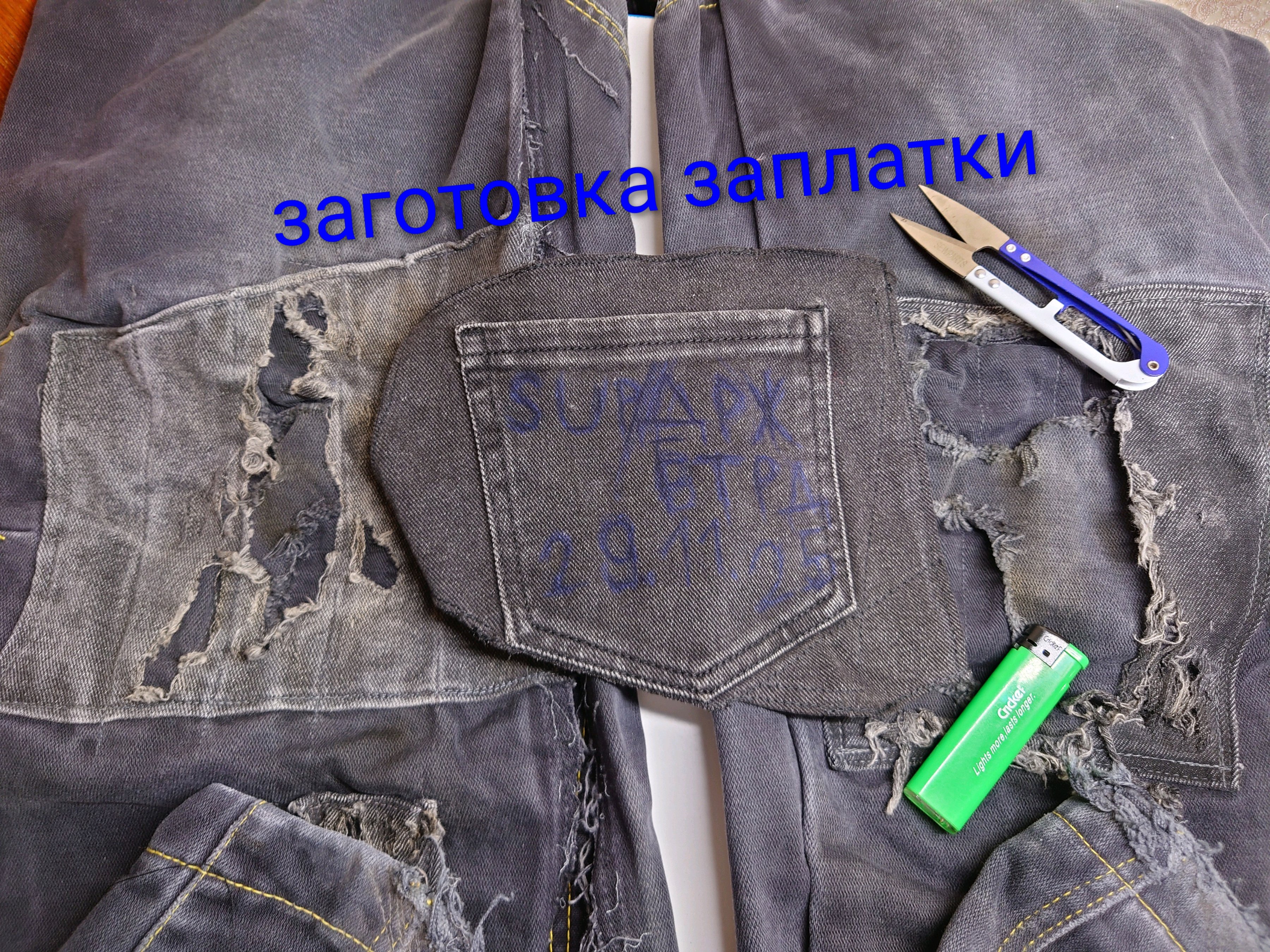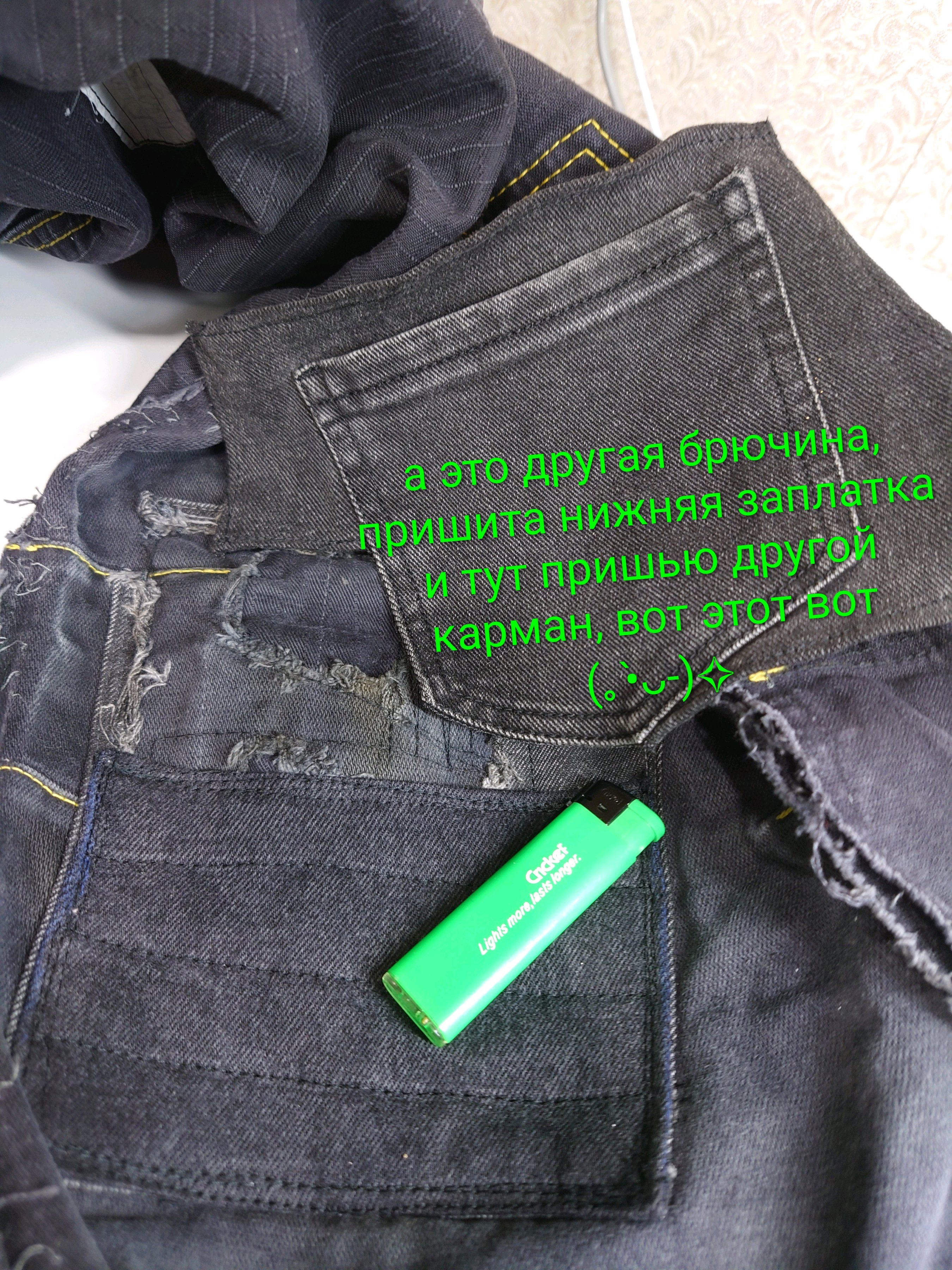 Привет дружботред! Сегодня весь вечер чинил работягам робы. Последнюю на сегодня (вчера(.❛ᴗ❛.) не закончил, поздно уже, спать пора. У работяги видно тяжёлая работа и его старве заплатки протёрлись и прожглись насквозь до ткани самой брючины, мне пришлось распарывать кем-то зашитые после прошлого ремонта швы. Из коробки с тканями для заплаток мне попались задние карманы джинс и я решил пришиь эти карманы на место заплаток. Пространство снизу зашил обычными заплатками, естественно с подшитыми углами, чтобы было красиво. Этот мучжчина явно мнго и изматывающе работает стоя на коленях, сдирая их до дыр и чем-то прожигая, поэтому было решено сделать ему дополнительные карманы для всчких мелочей + карман - это 2 слоя ткани, и так ткань на коленях дольше ему прослужит. Такой вот подарок и может быть забота из уважения за труд от меня ему, хоть я его и не знаю и никогда не видел 。◕‿◕。 Разметка на кармане специальная и легко стирается утюгом. Завтра я доделаю эти штаны. Как-то вот так :)
