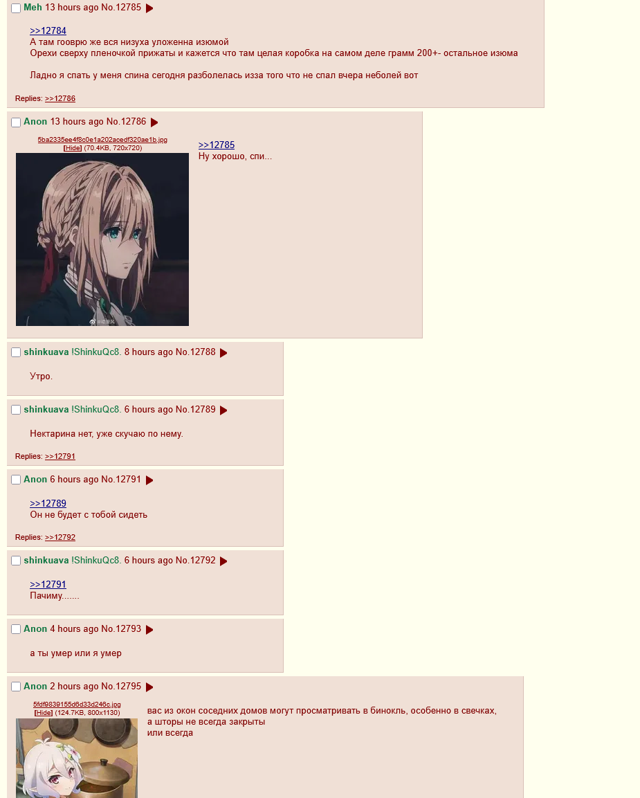 >>5647717 Нас отсюда выдавливают, а больше нам негде встречаться, и складывается ощущение очень такое вот.. ужасное.. >>5647718 Не столько страшно одному быть, сколько понимать что ты совсем один такой в этом мире и что даже если остальные хикки и есть то они общаются спокойно между собой на бордах..