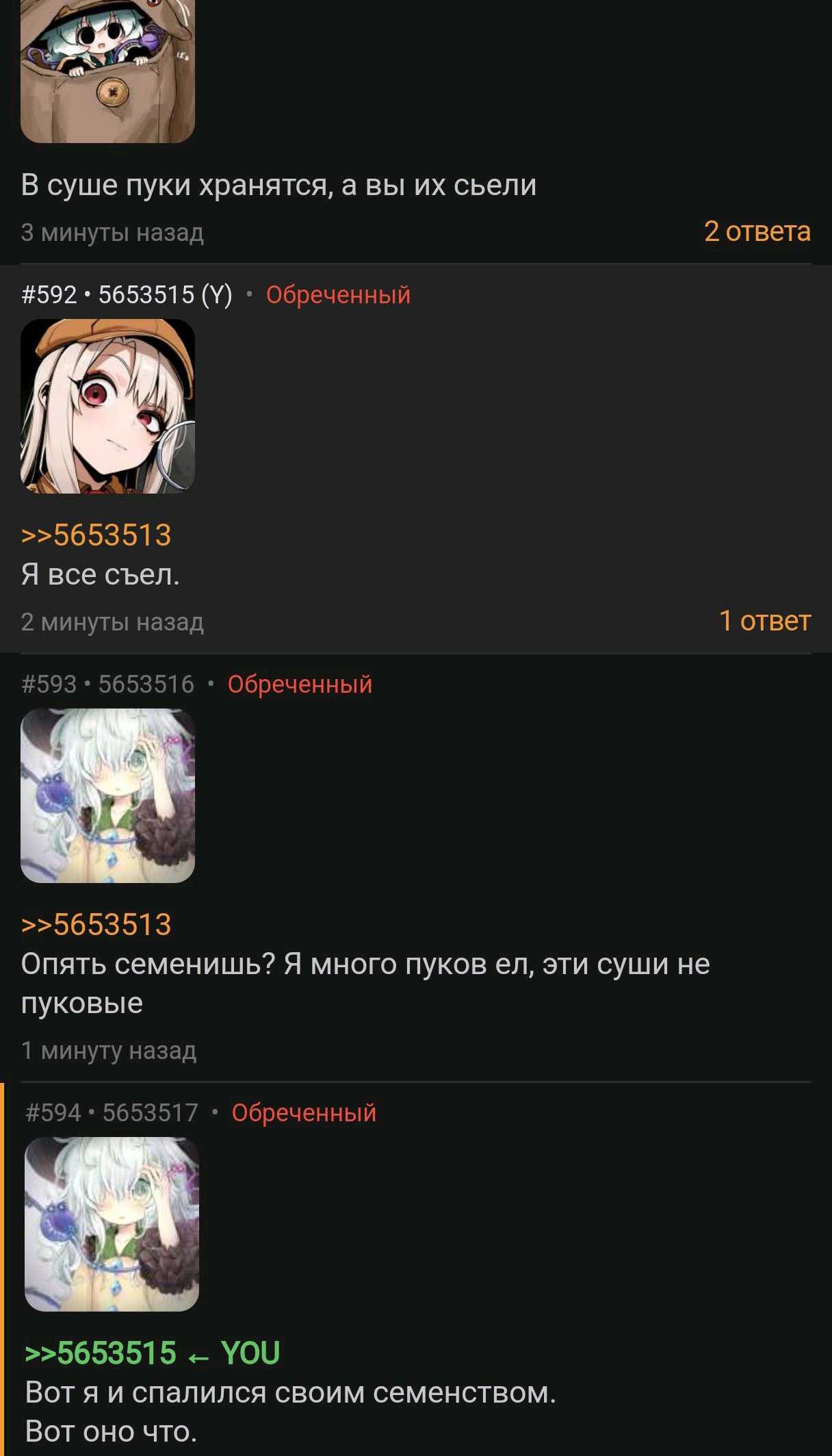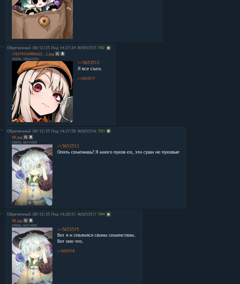 >>5653547 Ну ладно тогда прекращаю. Будем опять сидеть морковки обсуждать. А то я подумал тут румичку потерли и обижают, а тут оказывается конфочушки меня пытаются пооралить. Ну оно и не мудренно, глуповые подсосы они.