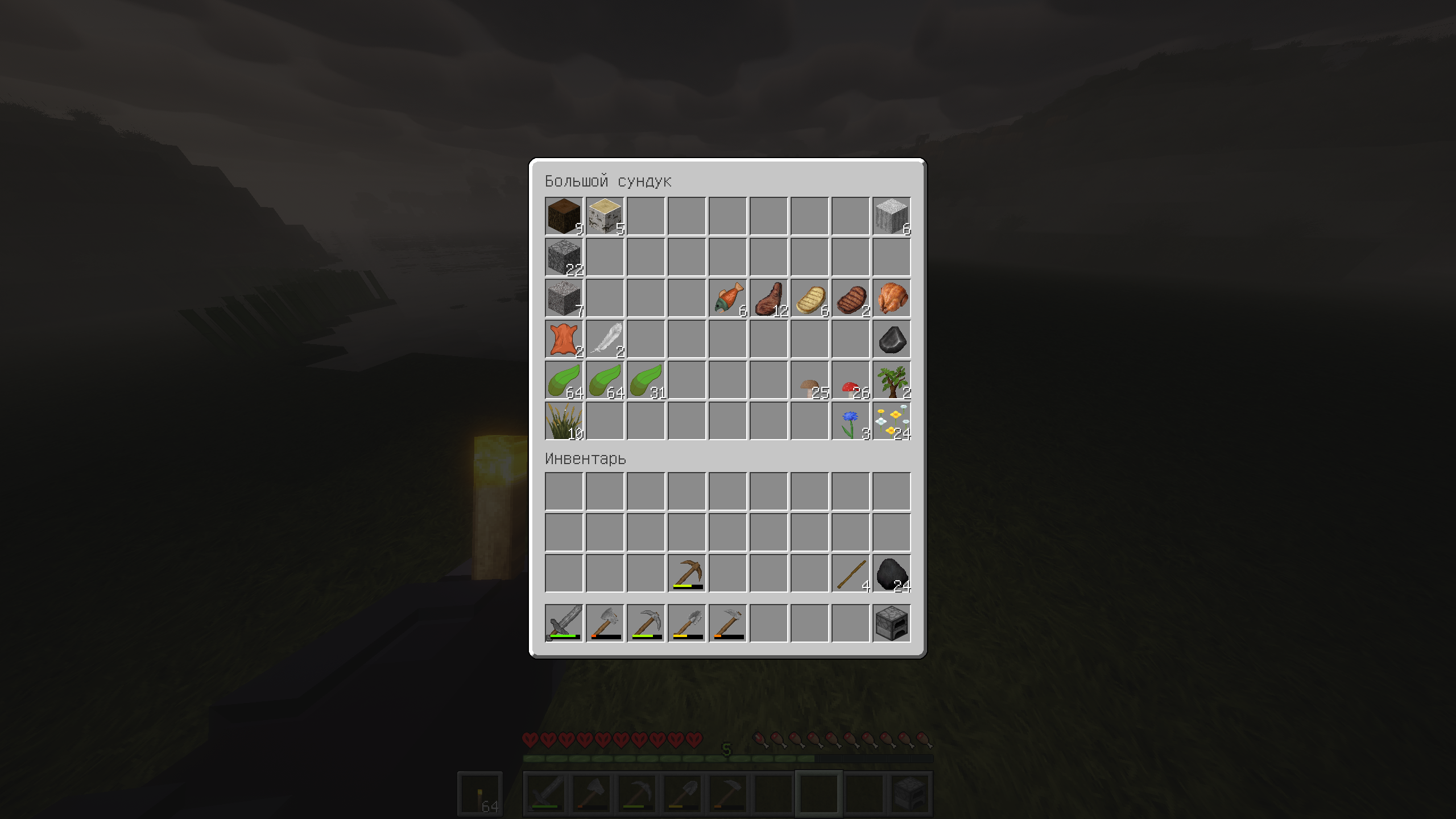 удалось пробиться из старой рощи в равнины, запас еды есть, ферма на полстака семян есть, тростник высажен, берег переделан под грядки железа нет, да и не до пещер, хочется ближайшую животину в ферму объединить. в речке дофига трески и водорослей, которые годны и в топливо, и в пищу, на крайний случай грибы для рассады есть, темный дуб высажен для подзольного разведения грибов еда прожарена на костре, поставленном на месте будущего лагеря