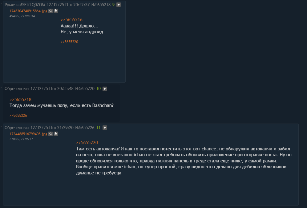 Там есть автокапча? Я как то поставил потестить этот вот chance, не обнаружил автокапчи и забил на него, пока не внезапно ichan не стал требовать обновить приложение при отправке поста. Ну он вроде обновился только что, правда нижняя панель в треде стала еще ниже, у самой рамки. Вообще нравится мне ichan, он супер простой, сразу видно что сделано для дебилов яблочников - думанье не требуеца