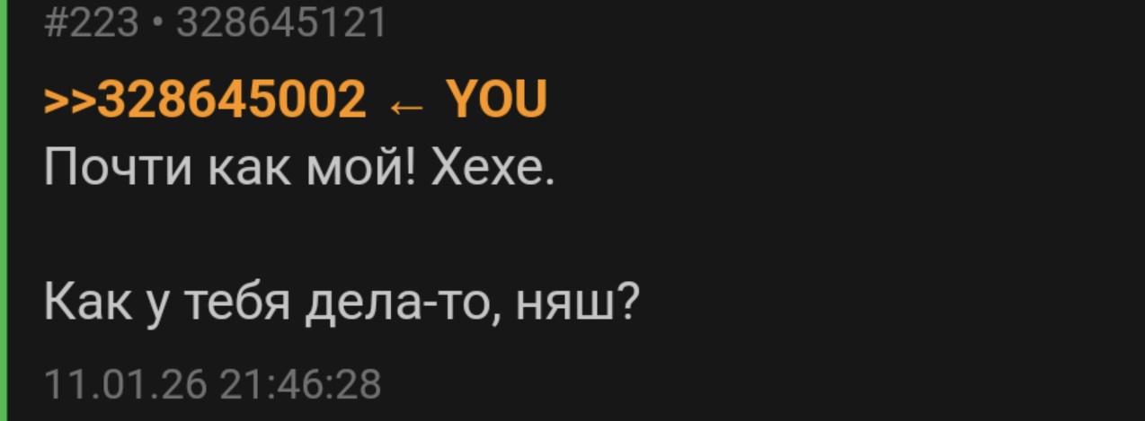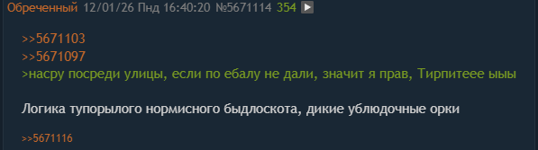 >>5675659 Два анончика в начале декабря поссорились. Один поворчал, пообзывался и забыл, а второй... Ополчился на весь тред и вот, в общем, оно. Уже скоро третий месяц как его кроет.