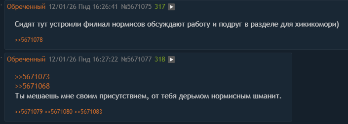 >>5671135 > иногда после долгого хикканства После долгого терпения в 4-х стенах* > У всех разная жизнь Пусть тогда не заходят в раздел rf, почему они именно сюда заходят, когда прямым текстом написано что это раздел для хикк которые изолируются от социума? Что ты мне пытаешься тут доказать? Вы тут пытаетесь наоборот все дружить и как то влиться в социум, вы не хикикомори и являетесь инородным объектом для этого раздела