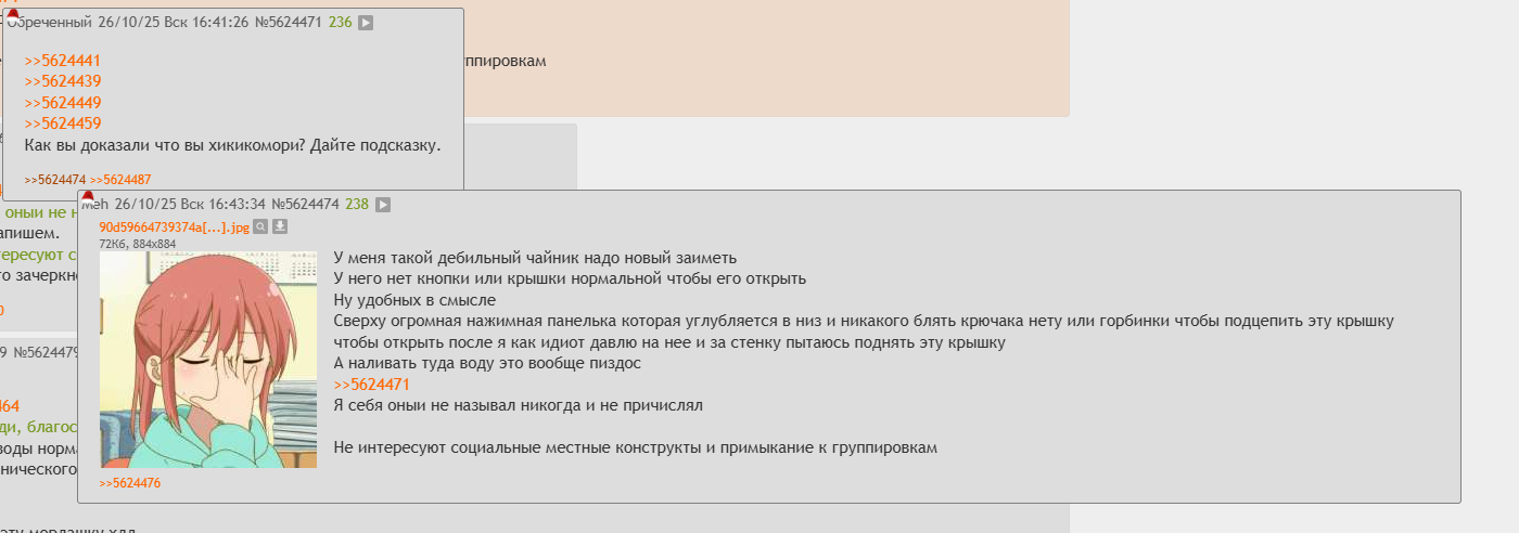 >>5669442 >да любой вноним, и не опровергнешь, как один написал Это не так работает, не всякий анонимный постер автоматически хикки. Скорее наоборот, ему нужно еще раскрыться как хикки. А не как серун который якобы борется с социками, это ничего не доказывает. >как Кобаяши ушел так не стало ничего, и они в основном общались между собой, показывая в тексте отношения к социоблядям в такой особой манере подтруниваний Да это было забавно и даже по своему мило.. Вот это можно назвать хикки-вайбом.. >да писали уже, и на фкей борде их нет, как и нет потребности в общении По-твоему у всех тру-хикк? Они не сидят на бордах?